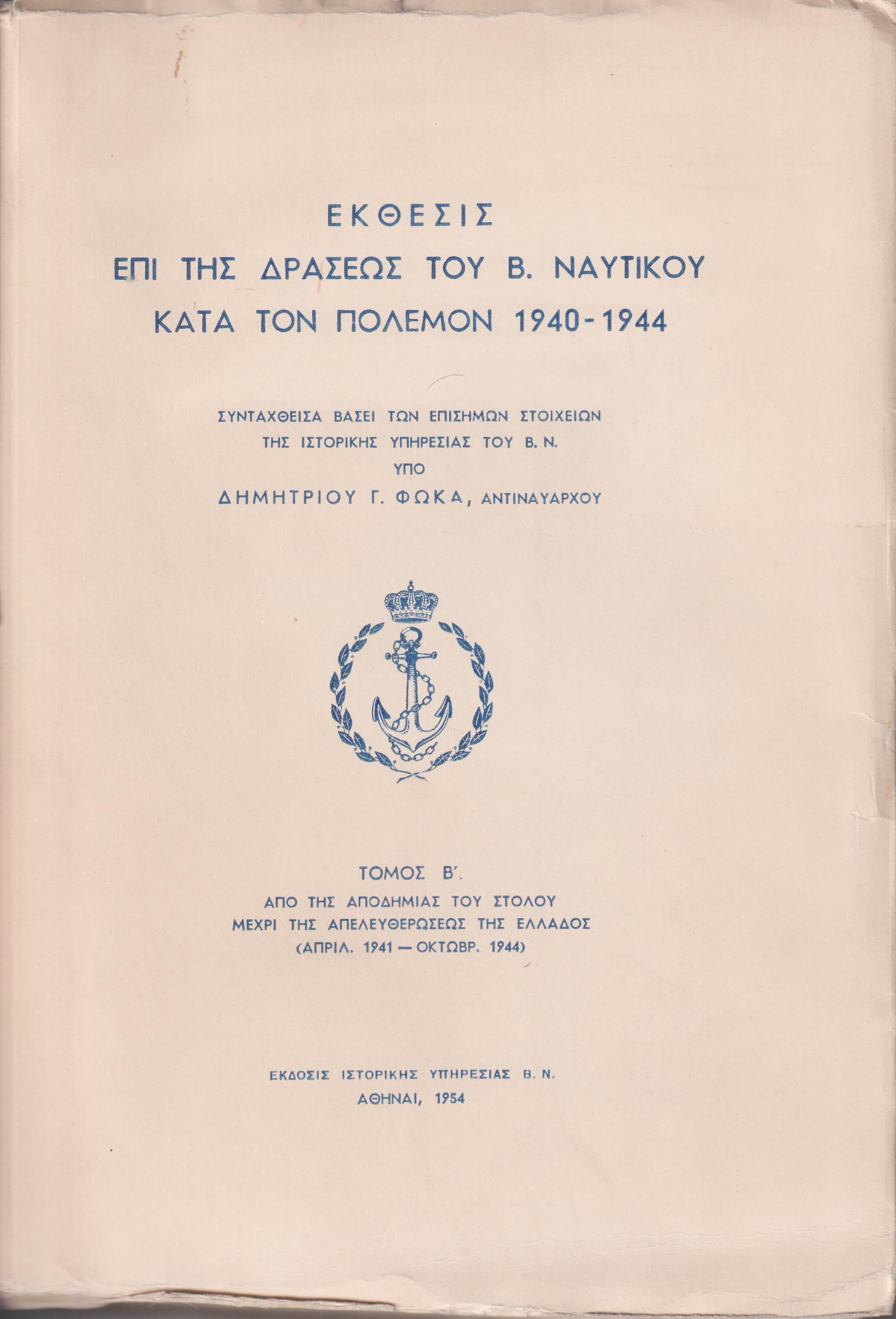 ΦΩΚΑ ΔΗΜΗΤΡΙΟΥ Γ. (Αντιναυάρχου) , ΄Εκθεσις επί της δράσεως του Β.Ναυτικού κατά τον πόλεμον 1940-1944. Συνταχθείσα βάσει των επισήμων στοιχείων της ιστορικής υπηρεσίας του Β.Ν. Τόμοι Α΄-Β΄. Αθήναι 1953-54, 8ο, σελ. ιστ΄+ 635+1λ+2πτ.χάρτες+ιδ΄+φ. 1+ 557 +1λ +φ.1+4πτ.χάρτες. Τόμος Α΄: Από της προπολεμικής περιόδου μέχρι της καταλήψεως της Ελλάδος (27 ΑΠΡΙΛΙΟΥ 1941), τόμος Β΄ : Από της αποδημίας του Στόλου μέχρι της απελευθερώσεως της Ελλάδος (ΑΠΡΙΛ.1941-ΟΚΤΩΒΡ.1944), (με αφιέρωση του συγγραφέα, αντίτυπο σε καλή κατάσταση, ο Α΄ τόμος άκοπα φύλλα)