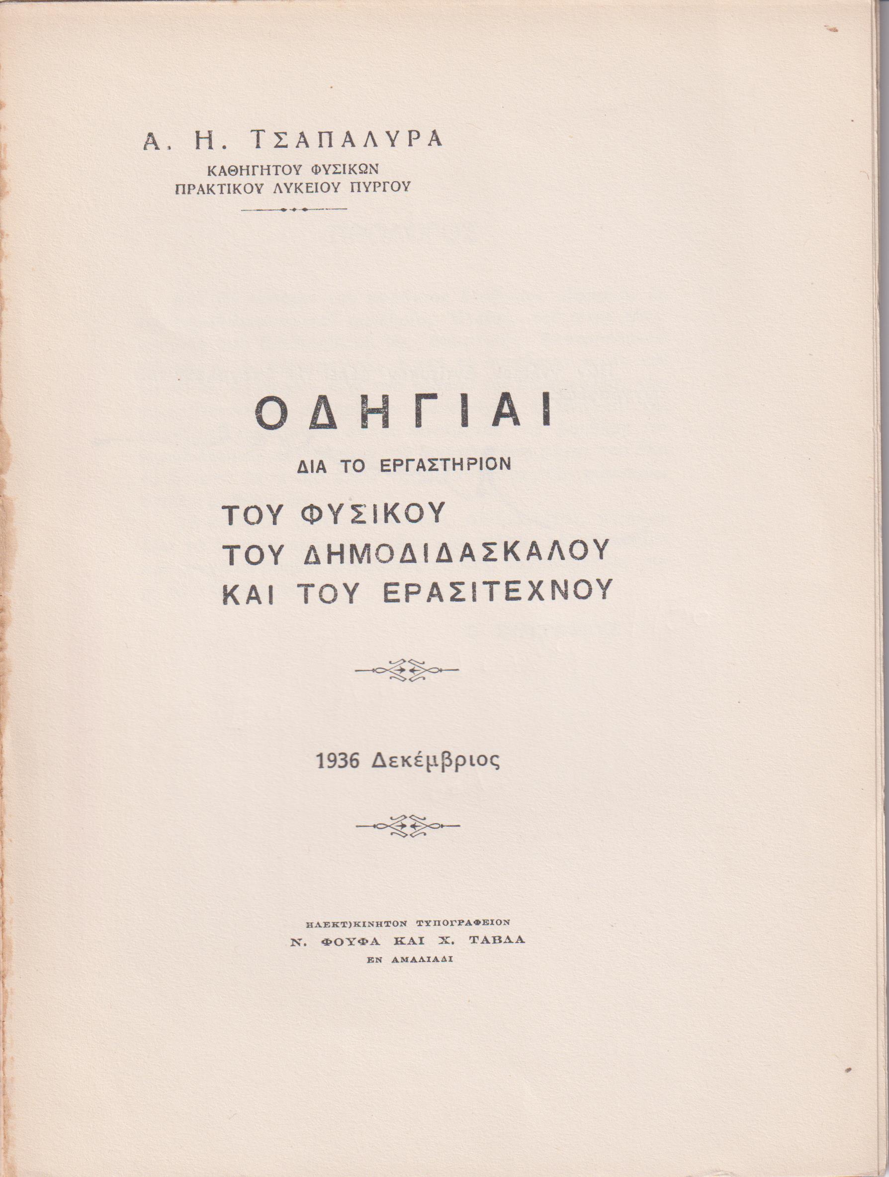 ΤΣΑΠΑΛΥΡΑΣ Α.Η. , Οδηγίαι διά το εργαστήριον του Φυσικού, του Δημοδιδασκάλου και του Ερασιτέχνου . Εν Αμαλιάδι 1937, 8ο, σελ. 70 (ΤΣΑΠΑΛΥΡΑΣ Α.Η. : Καθηγητής Φυσικών Πρακτικού Λυκείου Πύργου)