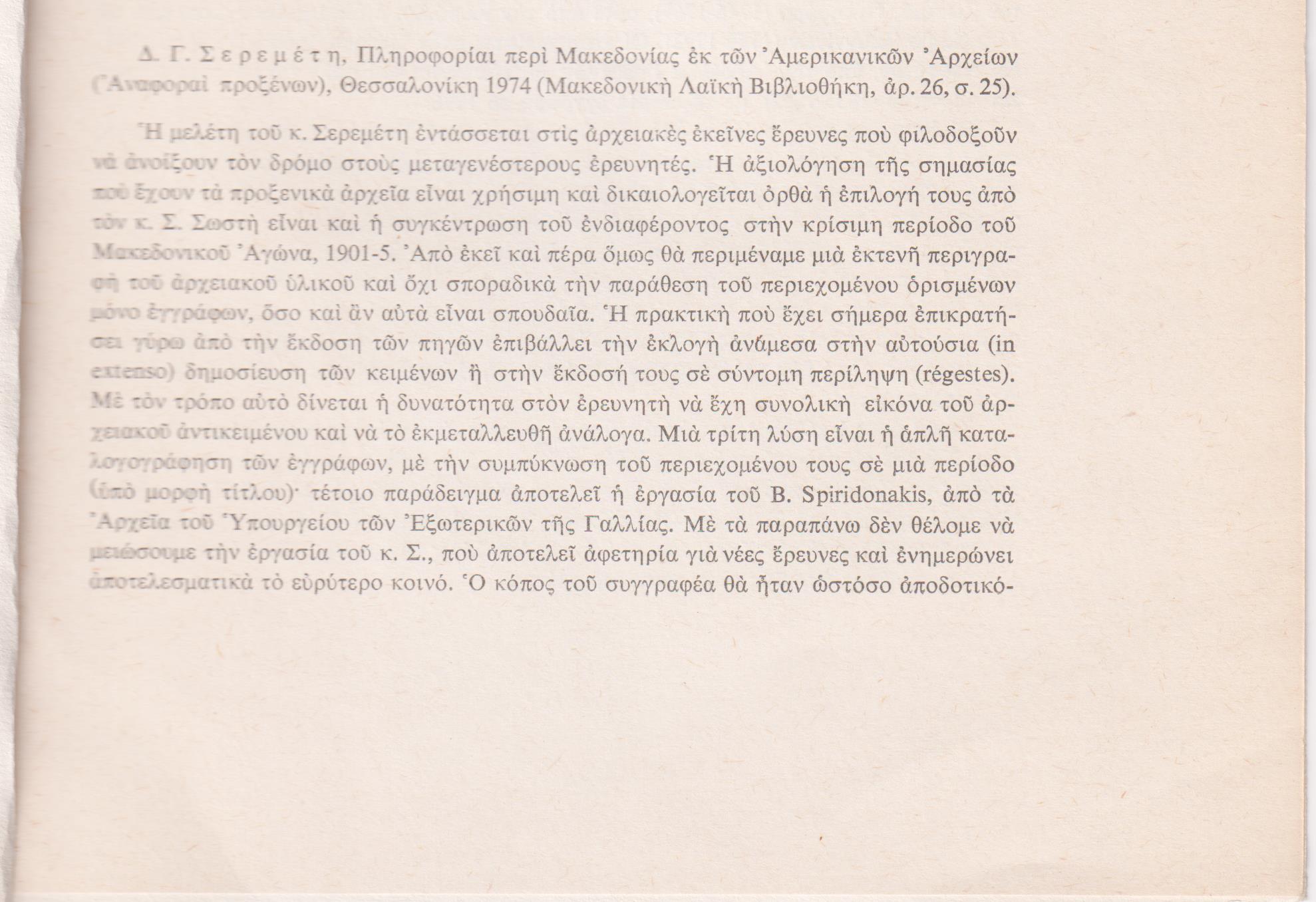 ΠΛΟΥΜΙΔΗΣ Γ., Βιβλιοκρισίαι: ΣΕΡΕΜΕΤΗ Δ. Γ., Πληροφορίαι περί Μακεδονίας εκ των Αμερικανικών Αρχείων (Αναφοραί Προξένων). Θεσσαλονίκη 1974. Θεσσαλονίκη 1975, 8ο, σελ.407-408 ανάτυπο.