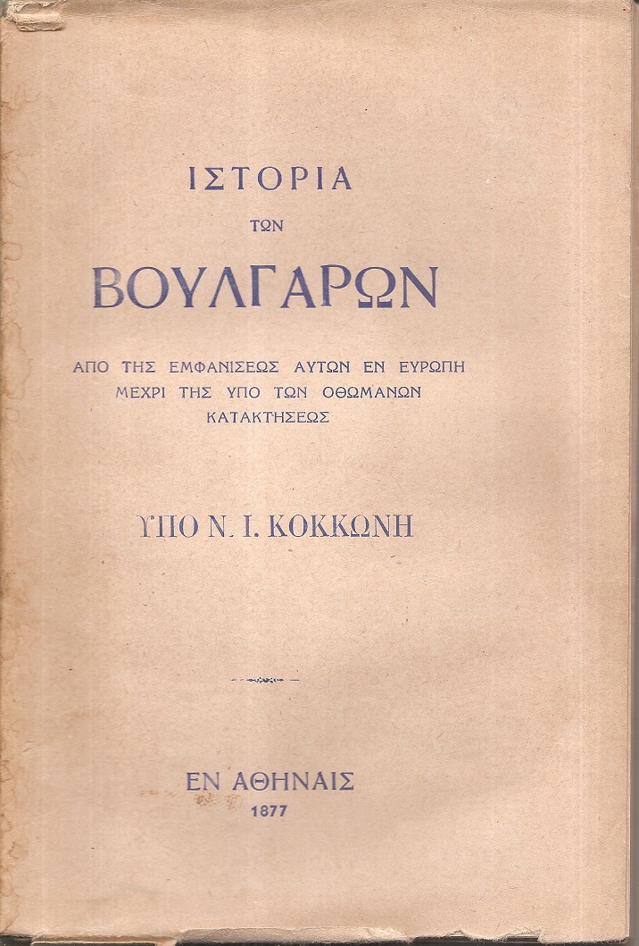 ΚΟΚΚΩΝΗΣ Ν. Ι., Η ιστορία των Βουλγάρων, από της εμφανίσεως αυτών εν Ευρώπη μέχρι της υπό των Οθωμανών κατακτήσεως. Εν Αθήναις 1877, 8ο, σελ. ιστ΄+244.