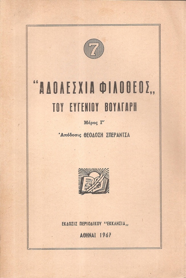 ΒΟΥΛΓΑΡΗΣ ΕΥΓΕΝΙΟΣ, Αδολεσχία Φιλόθεος του Ευγένιου Βούλγαρη, τόμοι Α΄-Γ΄ .Απόδοσις Θεοδόση Σπεράντζα. Αθήναι 1962-67, 8ο, σελ. 368+239+221