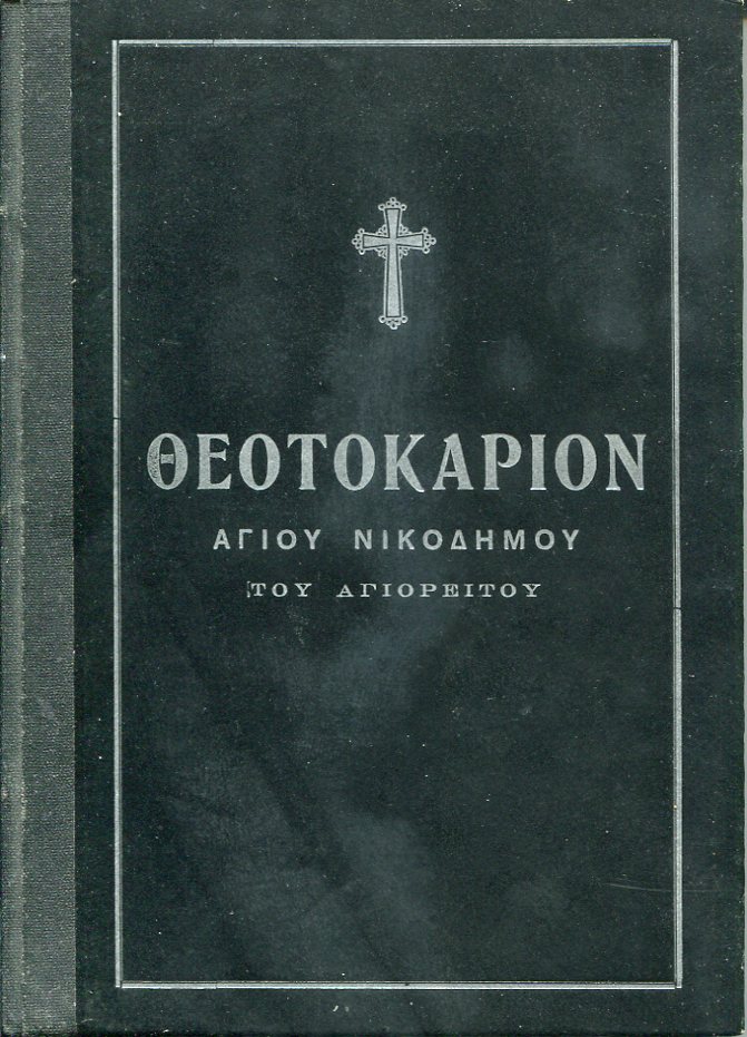 ΝΙΚΟΔΗΜΟΣ Ο ΑΓΙΟΡΕΙΤΗΣ, Θεοτοκάριον, νέον ποικίλον και ωραιότατον, Οκτώηχον. Περιέχον εξήκοντα δυο κανόνας προς την Υπεραγίαν Θεοτόκον. Μελουργηθέντας υπό είκοσι δυο ιερών και θεσπεσίων Μελωδών. Εκδοθέν το πρώτον παρά του Αγίου Νικοδήμου Αγιορείτου του Ναξίου. Εν Βόλω 1984, 8ο, σελ. 212 (βιομηχανική βιβλιοδεσία)
