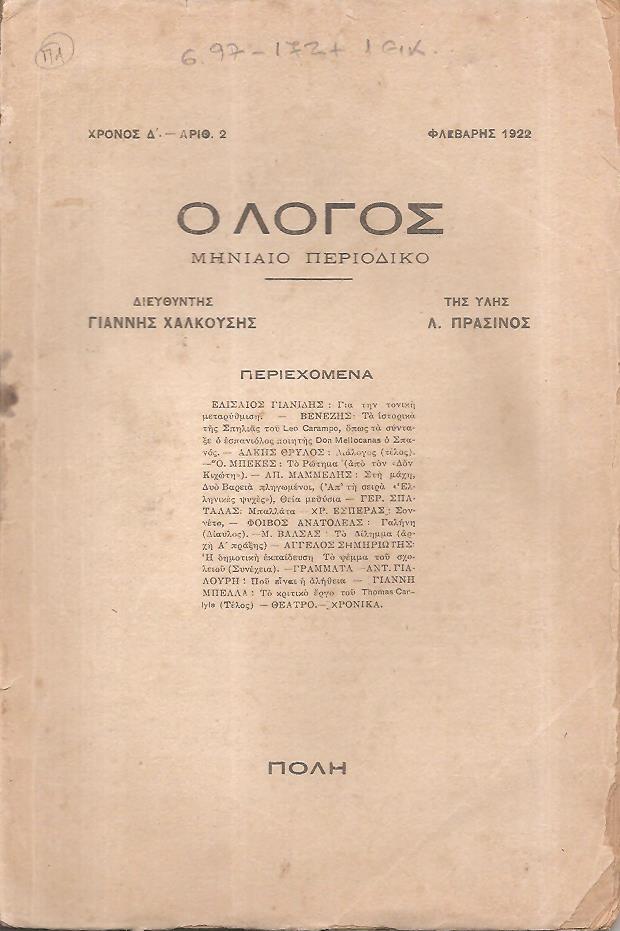 «ΛΟΓΟΣ [Ο] 1919-1922, Μηνιαίο περιοδικό. Διευθύνεται από τους κυρίους Ο. ΜΠΕΚΕ και ΓΙΑΝΝΗ ΧΑΛΚΟΥΣΗ. Από τον Γ΄χρόνο: Διευθυντής: ΓΙΑΝΝΗΣ ΧΑΛΚΟΥΣΗΣ, της ύλης: Λ.ΠΡΑΣΙΝΟΣ