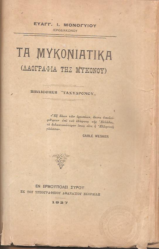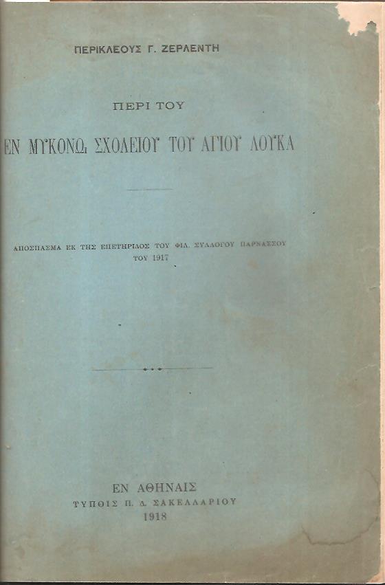ΒΕΝΙΕΡΗΣ Χ. ΜΙΧΑΗΛ (Καθηγητής εν τη Δημοσία Εμπορική Σχολή και Πρόεδρος του Συνδέσμου των εν Ερμουπόλει Μυκονίων), [1]. Η εν Μυκόνω Ιερά Μονή Τουρλιανή. ΄Εκδοσις 2α, διασκευασθείσα. Εν Ερμουπόλει Σύρου, ΕΚ ΤΟΥ ΤΥΠΟΛΙΘΟΓΡΑΦΕΙΟΥ ΝΙΚΟΛΑΟΥ ΦΡΕΡΗ, 1907, 16ο, σελ. ιστ΄+[17]-48 (πρόβλημα στις σελίδες ζ΄-ή & 47, λείπει το οπισθόφυλλο). [2]. ΕΥΑΓΓΕΛΙΔΗΣ ΤΡΥΦΩΝ Ε., Η Μύκονος ήτοι ιστορία της νήσου από των αρχαιοτάτων χρόνων μέχρι των καθ’ημάς. Εν Αθήναις 1914, 8ο, σελ. δ΄+[5]-290 (λείπουν σελίδες 291-318). [3]. ΖΕΡΛΕΝΤΗΣ ΠΕΡΙΚΛΗΣ Γ., Περί του εν Μυκόνω Σχολείου του Αγίου Λουκά. Απόσπασμα εκ της Επετηρίδος του Φιλ. Συλλόγου Παρνασσού του 1917. Εν Αθήναις, ΤΥΠΟΙΣ Π. Δ. ΣΑΚΕΛΛΑΡΙΟΥ, 1918, 8ο, σελ. 1λ+[176]-194(λείπει το οπισθόφυλλο). [4]. ΜΟΝΟΓΥΙΟΣ ΕΥΑΓΓ. Ι. (Ιεροδιακόνου), Τα Μυκονιάτικα, (Λαογραφία της Μυκόνου). Εν Ερμουπόλει Σύρου, ΕΚ ΤΟΥ ΤΥΠΟΓΡΑΦΕΙΟΥ ΑΘΑΝΑΣΙΟΥ ΣΚΟΡΔΙΛΗ, 1927, 8ο, σελ. ή+[9]-79+1χ.α. (τα τέσσερα βιβλία σ’ ένα δερματόδετο τόμο)