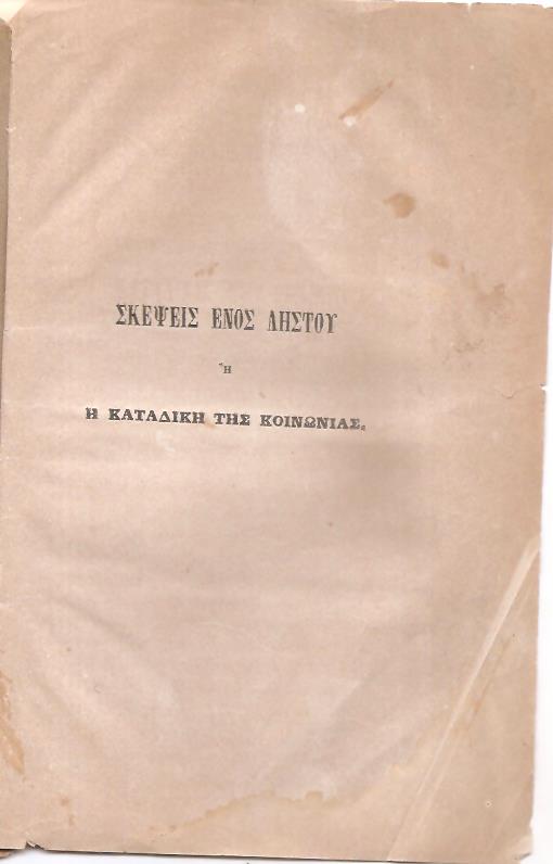 (ΠΑΠΑΡΡΗΓΟΠΟΥΛΟΣ Δ.), Σκέψεις ενός Ληστού ή η καταδίκη της κοινωνίας. Αθήνησι 1861, 8ο,σελ. 28 (ΓΚΙΝΗΣ-ΜΕΞΑΣ αρ. 8853)