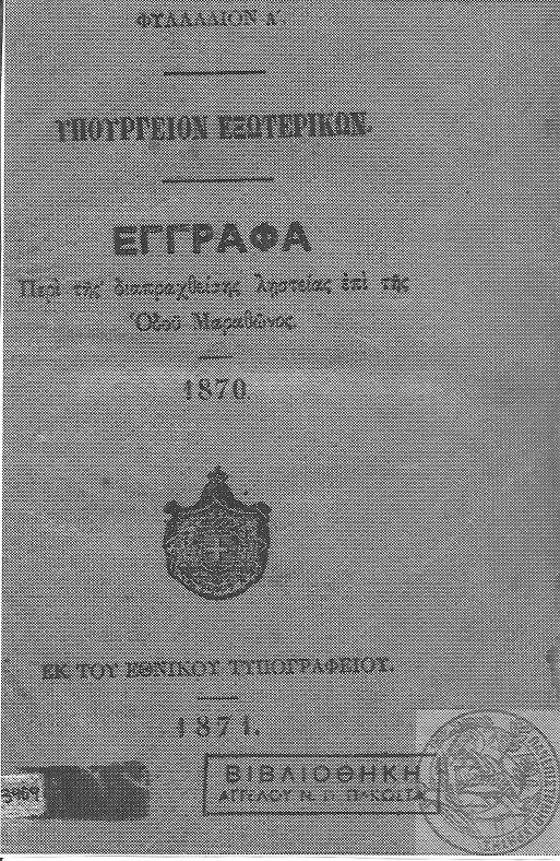 ΥΠΟΥΡΓΕΙΟΝ ΕΞΩΤΕΡΙΚΩΝ,  Φυλλάδιον Α΄. ΄Εγγραφα. Περί της διαπραχθείσης ληστείας επί της οδού Μαραθώνος. Εν μηνί Μαρτίω 1870. ΕΚ ΤΟΥ ΕΘΝΙΚΟΥ ΤΥΠΟΓΡΑΦΕΙΟΥ, 1871, 8ο, σελ. 102+2λ (το εξώφυλλο σε φωτοτυπία όπου και τίτλος, αλληλογραφία και έγγραφα του Υπουργείου Εξωτερικών σχετικά με την σφαγή του Δήλεσι,   ΗΛΙΟΥ-ΠΟΛΕΜΗ αρ. 1871.769)
