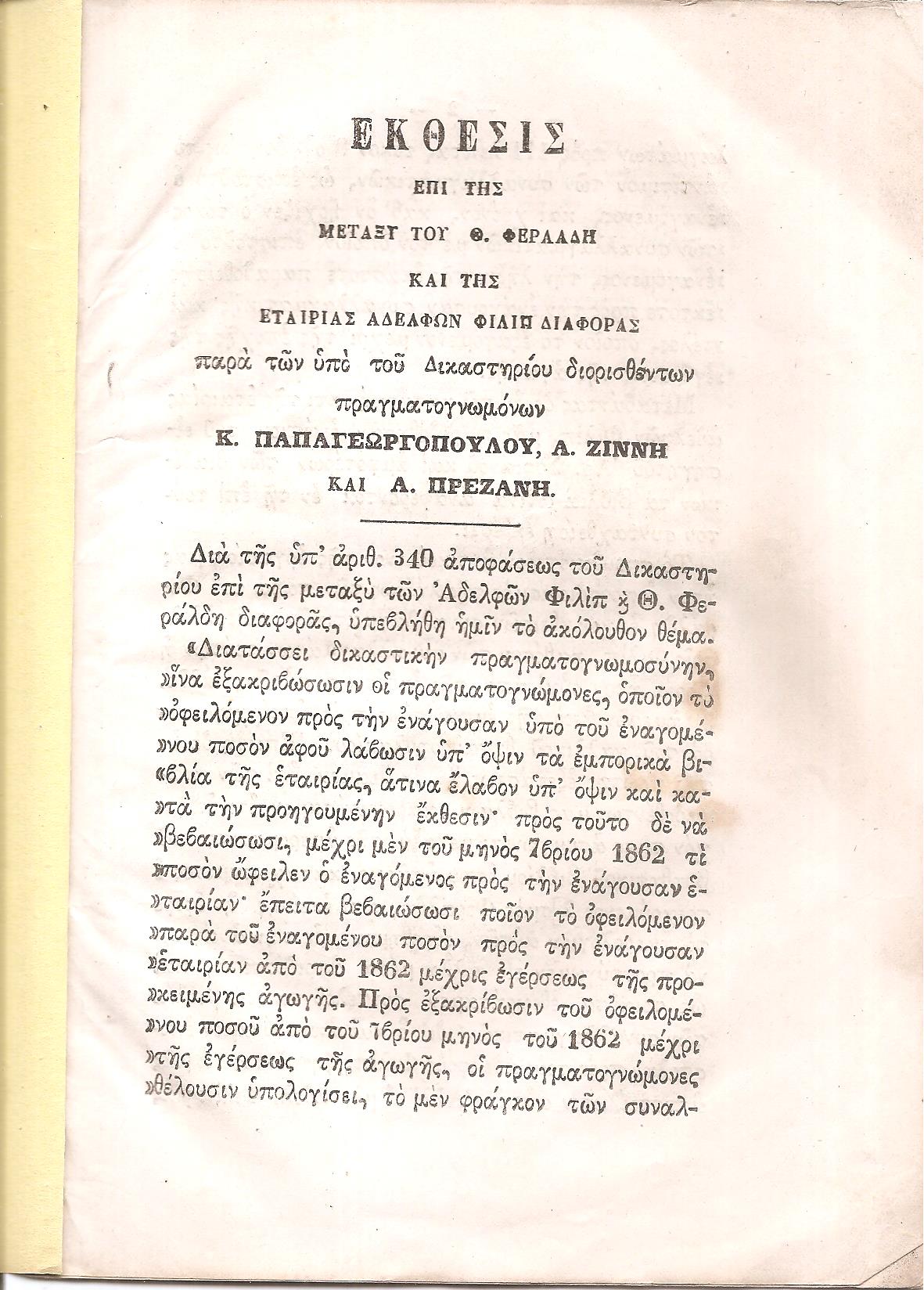 ΕΚΘΕΣΙΣ Α. Ζίννη Λογιστού της Εθνικής Τραπέζης Κ. Παπαγεωργοπούλου Λογιστού της Γεν. Πιστωτικής Τραπέζης και Α. Πρεζάνη Ταμίου της Βιομηχανικής Τραπέζης διορισθέντων πραγματογνωμόνων δυνάμει αποφάσεως των εν Αθήναις Εμποροδικών εις την μεταξύ της εταιρίας των αδελφών  Φιλίπ και Θ. Φεράλδη διαφοράν. Εν Αθήναις, ΤΥΠΟΙΣ «ΑΛΗΘΕΙΑΣ», 1877, 8ο, σελ. 16 (στην αρχή του κειμένου ο τίτλος: ΄Εκθεσις επί της μεταξύ του Θ. Φεράλδη και της Εταιρίας Αδελφών Φιλίπ διαφοράς…,     ΗΛΙΟΥ-ΠΟΛΕΜΗ αρ. 1877.147, σπάνιο)