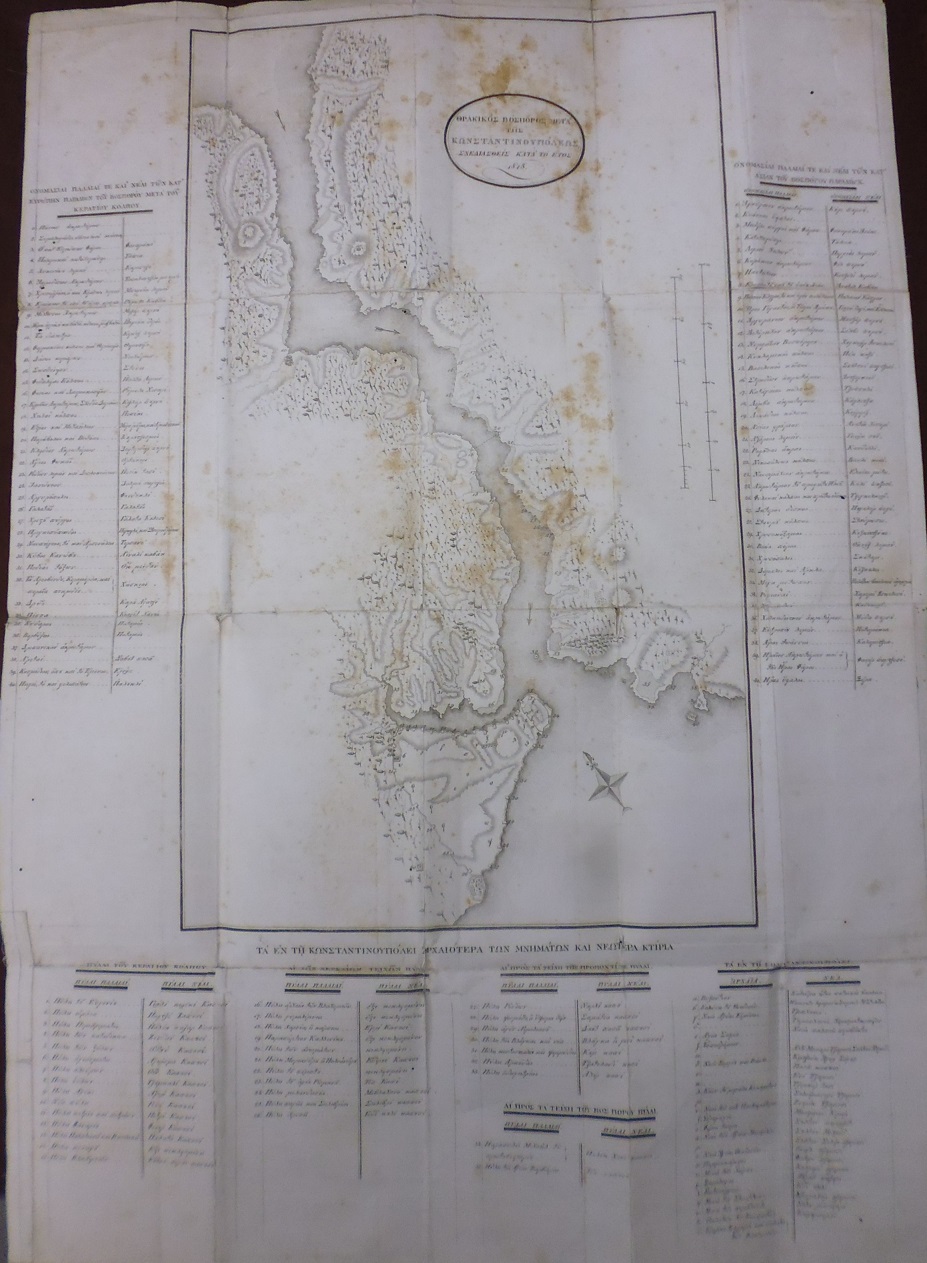 ΚΩΝΣΤΑΝΤΙΟΣ Α΄ ΚΩΝΣΤΑΝΤΙΝΟΥΠΟΛΕΩΣ, Κωνσταντινιάς. Παλαιά τε και Νεωτέρα ήτοι περιγραφή Κωνσταντινουπόλεως, Απ' αρχής μέχρι του νυν καθιστορούσα γενικώς τα της Πόλεως ταύτης, τας πέριξ αυτής Τοποθεσίας, τας τε αντιπροσώπους δύω Παραλίας των Στενών του Βοσπόρου, και τας παρακειμένας Νήσους τη Πόλει ταύτη. Συνταχθείσα παρά ανδρός Φιλολόγου και Φιλαρχαιολόγου. Εν Βενετία, ΠΑΡΑ ΠΑΝΩ ΘΕΟΔΟΣΙΟΥ ΤΩ ΕΞ ΙΩΑΝΝΙΝΩΝ, 1824, 8ο, σελ. η΄+196+5 αναδιπλ. πίν.+1 χάρτη (ο χάρτης επικολλημένος σε πανί, μειονεκτήματα: λείπουν οι σελίδες 197-198 πίναξ κεφαλαιών, οι δυο πίνακες σε φωτοτυπία, απόδετο, χρήζει βιβλιοδεσίας)