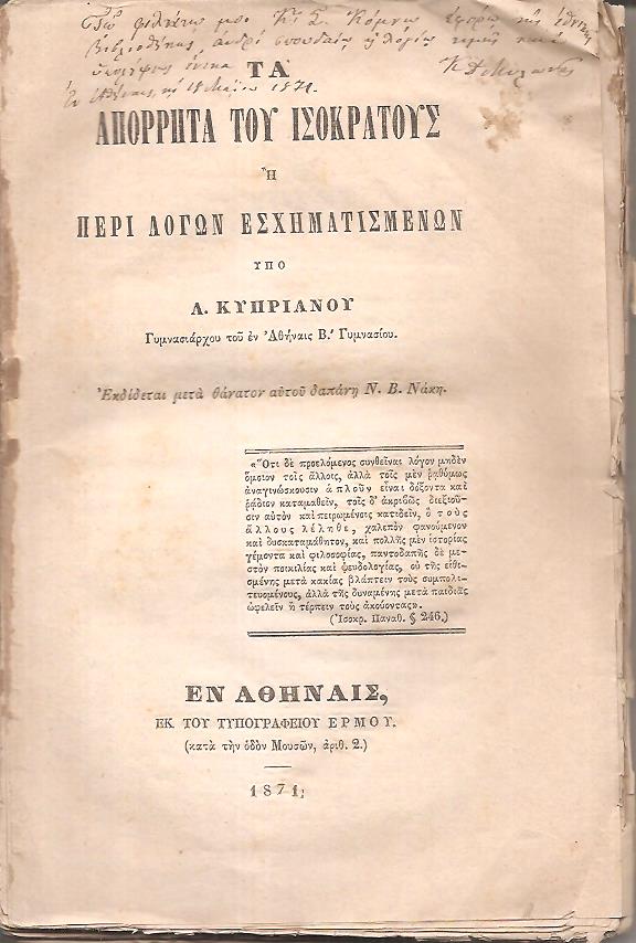 ΚΥΠΡΙΑΝΟΥ Α. Γυμνασιάρχου του εν Αθήναις Β΄ Γυμνασίου, Τα απόρρητα του Ισοκράτους ή περί λόγων εσχηματισμένων. Εκδίδεται μετά θάνατον αυτού δαάνη Ν. Β. Νάκη. Εν Αθήναις, ΕΚ ΤΟΥ ΤΥΠΟΓΡΑΦΕΙΟΥ ΕΡΜΟΥ, 1871, 8ο, σελ. κ΄+235+1λ (αντίτυπο ταλαιπωρημένο κυρίως το τελευταίο φύλλο, λυτό, λείπει το οπισθόφυλλο, ΗΛΙΟΥ-ΠΟΛΕΜΗ αρ. 1871.707)