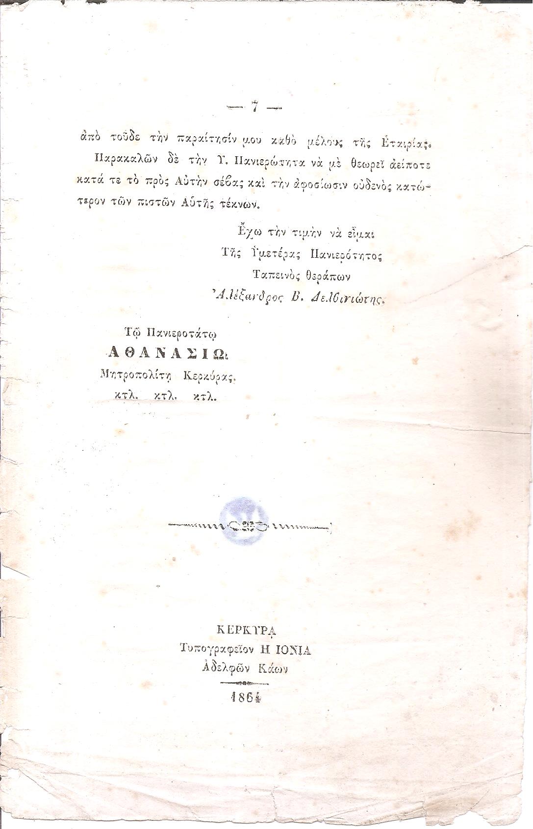 Κέρκυρα, τη 29 Ιουλίου 1864. Πανιερώτατε, Μετά την διαδήλωσιν… Κέρκυρα, ΤΥΠΟΓΡΑΦΕΊΟΝ Η ΙΟΝΙΑ ΑΔΕΛΦΩΝ ΚΑΩΝ, 1864, 8ο, σελ. 7+1λ (χωρίς εξώφυλλο, ο τίτλος στην αρχή του κειμένου, στο τέλος σελίδα 7, υπογραφή : Αλέξανδρος Β. Δελβινιώτης. Τω Πανιεροτάτω ΑΘΑΝΑΣΙΩ Μητροπολίτη Κερκύρας. ΚΕΡΚΥΡΑ Τυπογραφείον Η ΙΟΝΙΑ Αδελφών Κάων- 1864, σπάνιο, ΗΛΙΟΥ-ΠΛΕΜΗ αρ.1864.254)