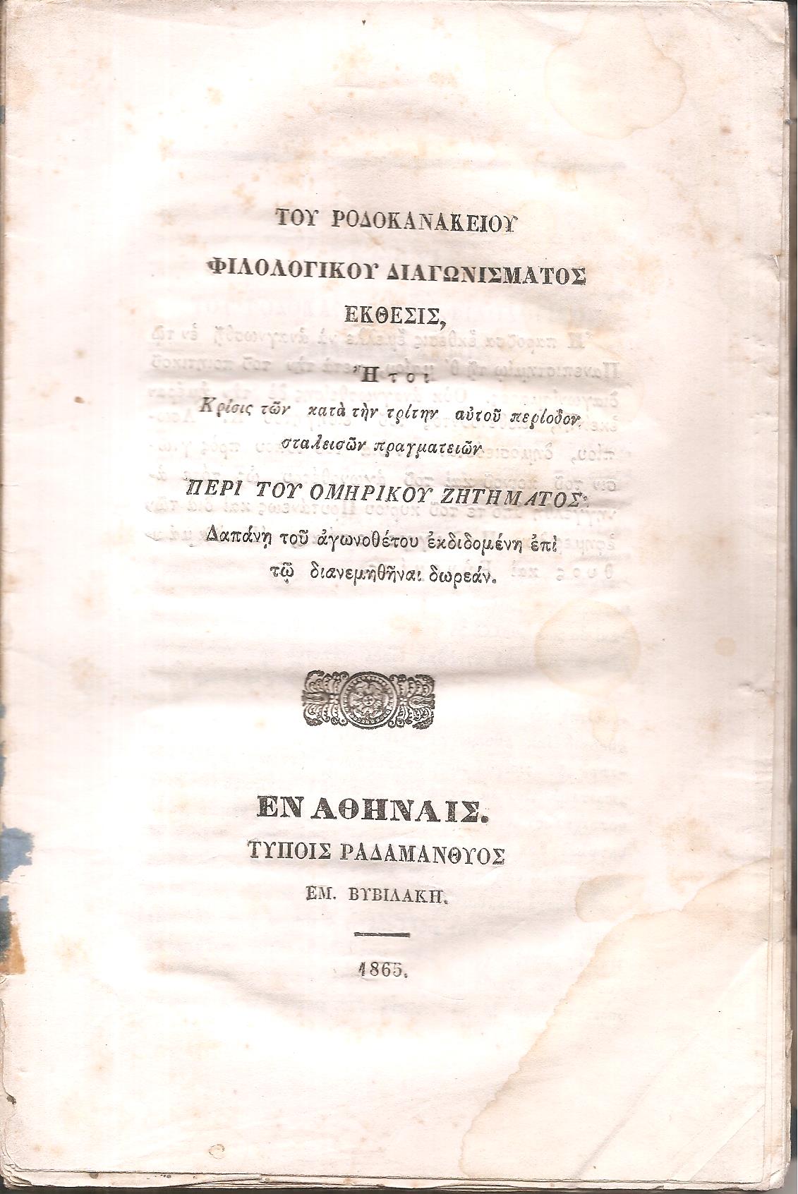 ΄Εκθεσις του Ροδοκανακείου Φιλολογικού Διαγωνίσματος, ήτοι Κρίσις των κατά την τρίτην αυτού περίοδον σταλεισών πραγματειών περί του Ομηρικού ζητήματος. Δαπάνη του αγωνοθέτου εκδιδομένη επί τω διανεμηθήναι δωρεάν. Εν Αθήναις, ΤΥΠΟΙΣ ΡΑΔΑΜΑΝΘΥΟΣ ΕΜ. ΒΥΒΙΛΑΚΗ, 1865, 8ο, σελ. 156 (άκοπα φύλλα, κατάσταση μέτρια, ΗΛΙΟΥ-ΠΟΛΕΜΗ αρ. 1865.619)