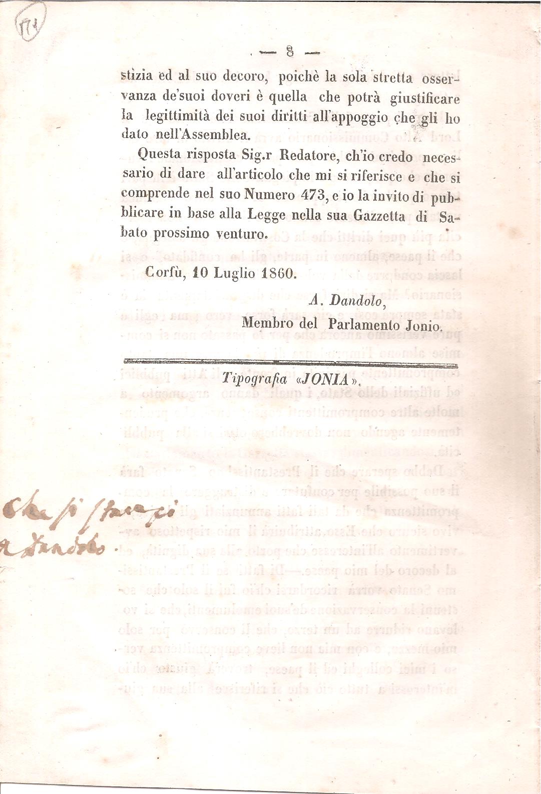 DANDOLO A., Al Sig.r Editore della Gazzetta Uffiziale del Governo nella Stamperia pubblica in Corfù. 8ο, σελ. 8 (απόδετο, χωρίς εξώφυλλο, στο τέλος της σελίδας αρ. 8 : Corfù, 10 Luglio 1860. A. Dandolo, Membro del Parlamento Ionio. TIPOGRAFIA “IONIA”)