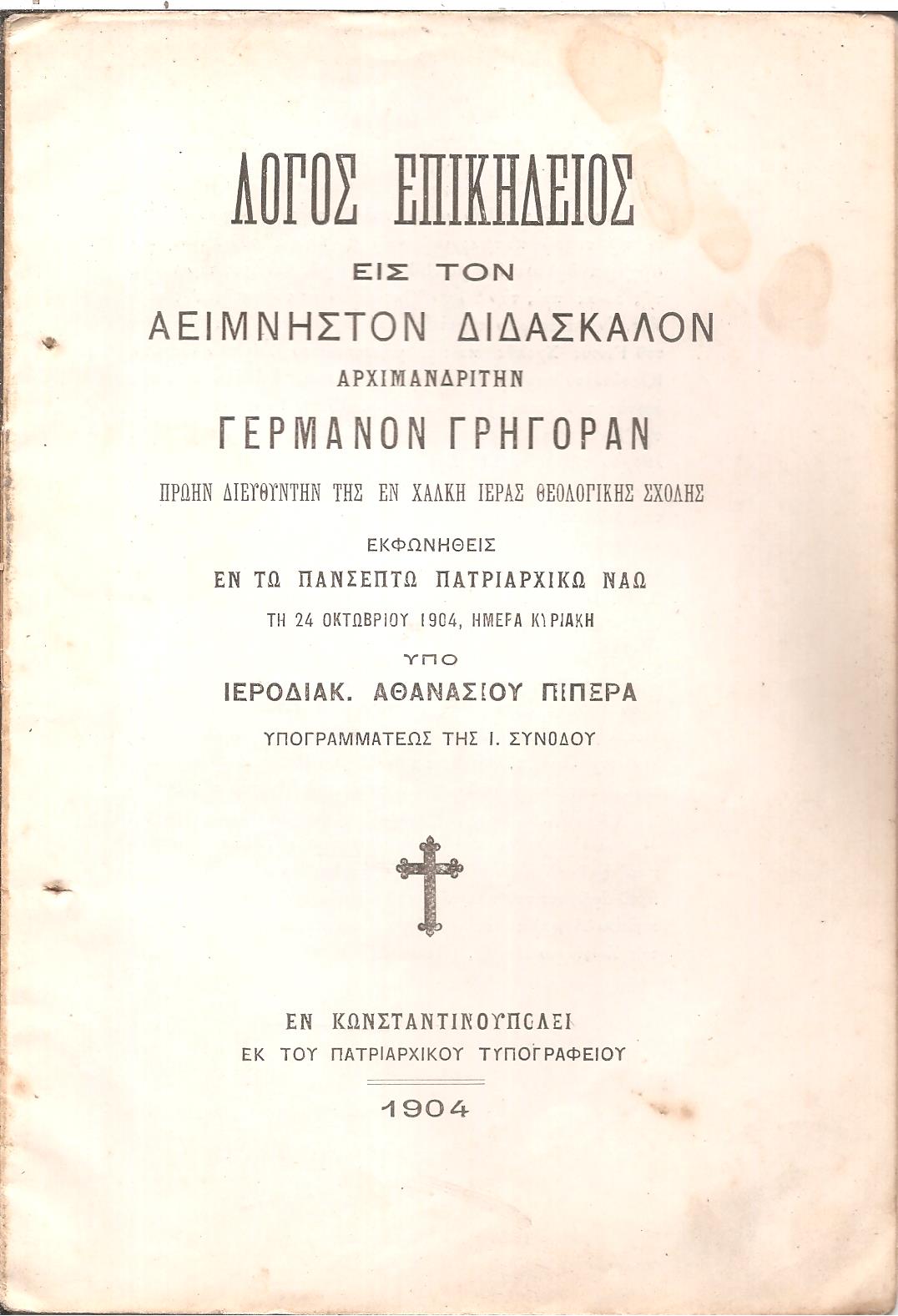 ΠΙΠΕΡΑΣ ΑΘΑΝΑΣΙΟΣ Ιεροδιάκονος, Λόγος επικήδειος εις τον Αείμνηστον Διδάσκαλον Αρχιμανδρίτην Γερμανόν Γρηγοράν. Εν Κωνσταντινουπόλει, ΕΚ ΤΟΥ ΠΑΤΡΑΡΧΙΚΟΎ ΤΥΠΟΓΡΑΦΕΙΟΥ, 1904, 8ο, σελ. 16