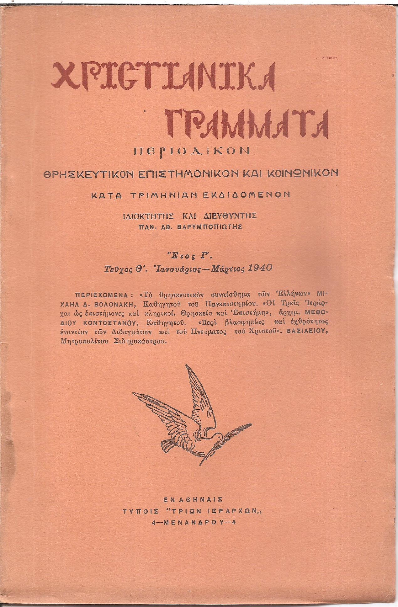 ΧΡΙΣΤΙΑΝΙΚΑ ΓΡΑΜΜΑΤΑ 1938-1941, έτη Α΄-Δ΄, Περιοδικόν θρησκευτικόν, επιστημονικόν και κοινωνικόν κατά τριμηνίαν εκδιδόμενον. Ιδιοκτήτης και Διευθυντής ΠΑΝ. ΑΘ. ΒΑΡΥΜΠΟΠΙΩΤΗΣ. Εν Αθήναις 1938-1941, 8ο, (Διαθέτουμε: ΄Ετος Α΄, τεύχος Α΄[Ιανουάριος-Μάρτιος 1938], σελ. 47+1χ.α., τεύχος Β΄[Απρίλιος-Ιούνιος 1938], σελ. 49-112, τεύχος Γ΄[Ιούλιος- Σεπτέμβριος 1938], σελ. 113-160, λείπει το Δ΄τεύχος [Οκτώβριος- Δεκέμβριος 1938], ΄Ετος Β΄, τεύχος Ε΄[Ιανουάριος-Μάρτιος 1939], σελ. 61+3χ.α., ίχνη υγρασίας, τεύχος ΣΤ΄[Απρίλιος-Ιούνιος 1939], σελ. 65-115+1λ, τεύχος Ζ΄[Ιούλιος- Σεπτέμβριος 1939], σελ. 117-167+1λ, τεύχος Η΄[Οκτώβριος-Δεκέμβριος 1939], σελ. 169-216, ΠΛΗΡΕΣ ΕΤΟΣ, ΄Ετος Γ΄, τεύχος Θ΄[Ιανουάριος-Μάρτιος 1940], σελ. 40, τεύχος Ι΄[Απρίλιος-Ιούνιος 1940], σελ. 41-82, τεύχος ΙΑ΄[Ιούλιος- Σεπτέμβριος 1940], σελ. 83-122, τεύχος ΙΒ΄[Οκτώβριος-Δεκέμβριος 1940], σελ. 123-164, ΠΛΗΡΕΣ ΕΤΟΣ, ΄Ετος Δ΄, τεύχος ΙΓ΄[Ιανουάριος-Μάρτιος 1941], σελ. 52, τεύχος ΙΔ΄[Απρίλιος-Ιούνιος 1941], σελ. 53-96, τεύχος ΙΕ΄-ΙΣΤ΄[Ιούλιος- Δεκέμβριος 1941], σελ. 97-122, ΠΛΗΡΕΣ ΕΤΟΣ). Σύνολον 14 τεύχη με τα εξώφυλλα