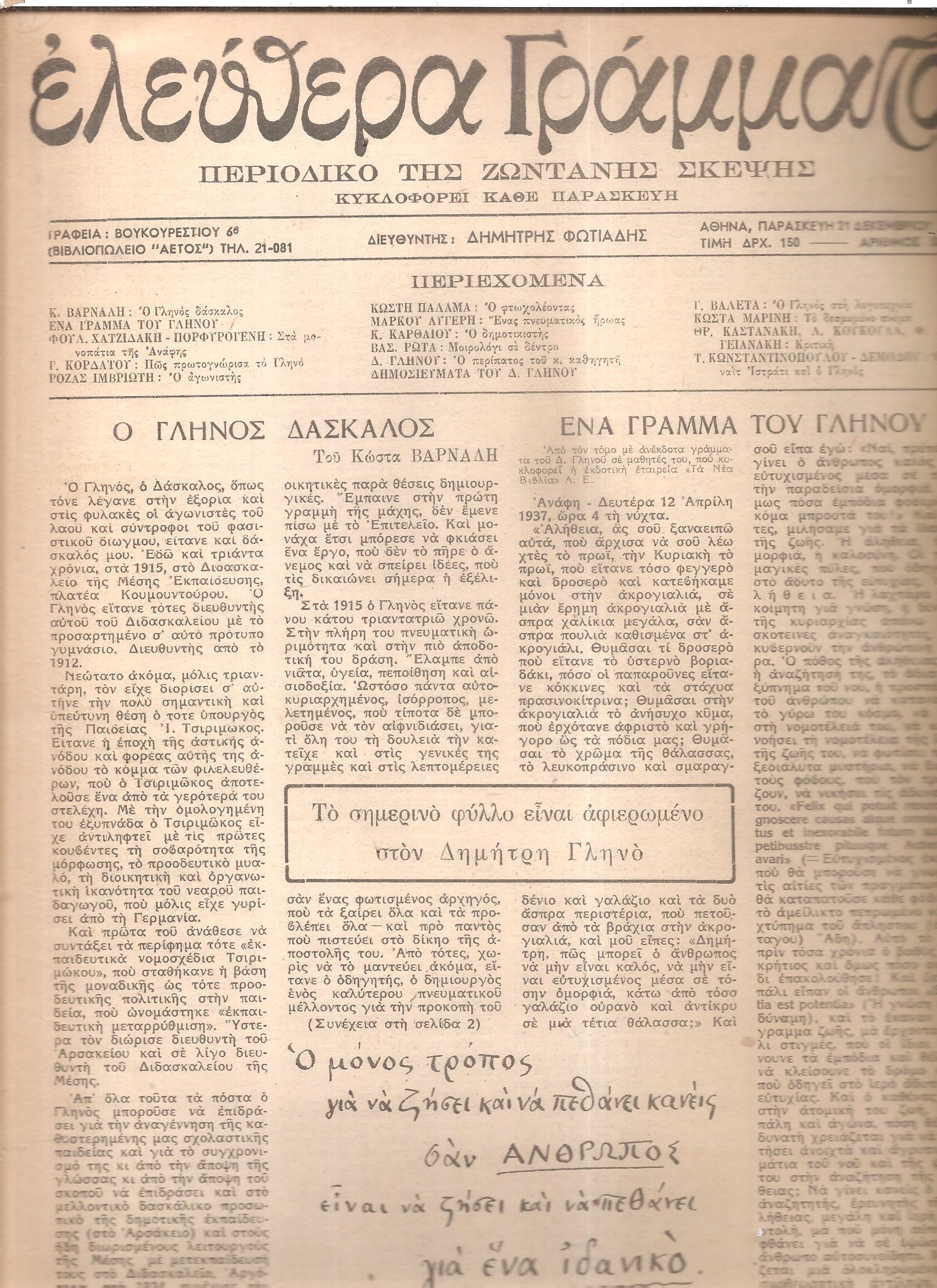ΕΛΕΥΘΕΡΑ ΓΡΑΜΜΑΤΑ Περίοδος Α΄, τόμος Α΄, 1945, Περιοδικό της ζωντανής σκέψης-κυκλοφορεί κάθε Σάββατο. Διευθυντής: Δημήτρης Φωτιάδης. Αθήνα 1945, 4ο [25Χ35], σελ. 16[το τεύχος]. (Τόμος Α΄, τεύχη αρ. 1[5 Μαΐου 1945]έως αρ. 32-33[21 Δεκεμβρίου 1945], κάθε τεύχος 16σέλιδο), μετά το 10ο τεύχος κυκλοφορούσε κάθε Παρασκευή. Δημοσιεύματα των: ΦΩΤΗ ΑΓΓΟΥΛΕ, ΕΛΛΗΣ ΑΛΕΞΙΟΥ, Φ. ΑΝΩΓΕΙΑΝΝΑΚΗ, ΜΕΛΠΩΣ ΑΞΙΩΤΗ, ΦΩΤΗ ΑΣΤΕΡΗ, ΜΑΡΚΟΥ ΑΥΓΕΡΗ, Κ. ΒΑΡΝΑΛΗ, ΣΠ. ΒΑΣΙΛΕΙΟΥ, ΗΛ. ΒΕΝΕΖΗ, ΔΗΜΟΣΘ. ΒΟΥΤΥΡΑ, ΝΙΚ. ΒΡΕΤΤΑΚΟΥ, ΤΑΤΙΑΝΑΣ ΓΚΡΙΤΖΗ-ΜΙΛΛΙΕΞ, ΦΩΤΟΥ ΓΙΟΦΥΛΛΗ, ΛΕΥΤ. ΓΡΗΓΟΡΙΟΥ, Ν. ΖΑΧΑΡΙΑΔΗ, ΑΓΙ ΘΕΡΟΥ, Γ. ΘΕΜΕΛΗ, ΡΟΖΑ ΙΜΒΡΙΩΤΗ, Χ. ΘΕΟΔΩΡΙΔΗ, Ν. ΚΑΒΒΑΔΙΑ, Ν. ΚΑΖΑΝΤΖΑΚΗ-Ι.Θ. ΚΑΚΡΙΔΗ, ΘΡ. ΚΑΣΤΑΝΑΚΗ, ΝΙΚΟΥ ΚΑΣΤΡΙΝΟΥ, ΦΩΤΗ ΚΟΝΤΟΓΛΟΥ, Γ. ΚΟΡΔΑΤΟΥ, Θ. ΚΟΡΝΑΡΟΥ, Γ. ΚΟΤΖΙΟΥΛΑ, Λ. ΚΟΥΚΟΥΛΑ, Γ. ΛΑΜΠΡΙΝΟΥ, ΧΡ. ΛΕΒΑΝΤΑ, Π. ΛΕΚΑΤΣΑ, ΜΕΝ. ΛΟΥΝΤΕΜΗ, Γ. ΜΑΚΡΗ, ΤΙΜΟΥ ΜΑΛΑΝΟΥ, ΣΟΦ. ΜΑΥΡΟΕΙΔΗ-ΠΑΠΑΔΑΚΗ, Ρ. ΜΙΛΛΙΕΞ, ΡΙΤΑΣ ΜΠΟΥΜΗ-ΠΑΠΑ, ΜΥΡΤΙΩΤΙΣΣΑΣ, ΛΕΩΝ. ΜΩΡΑΪΤΗ, ΚΟΛΙΑ ΝΗΣΙΩΤΗ, ΣΤ. ΞΕΦΛΟΥΔΑ, Ι. Μ. ΠΑΝΑΓΙΩΤΟΠΟΥΛΟΥ, ΔΗΜ. ΠΑΝΔΗ, Α. ΠΑΝΣΕΛΗΝΟΥ, ΝΙΚΟΥ Δ. ΠΑΠΑ, ΕΛΛΗΣ ΠΑΠΑΔΗΜΗΤΡΙΟΥ, ΛΙΛΗΣ ΠΑΤΡΙΚΙΟΥ-ΙΑΚΩΒΙΔΗ, ΜΙΧ. ΠΕΡΑΝΘΗ, Θ. ΠΙΕΡΙΔΗ, ΚΟΣΜΑ ΠΟΛΙΤΗ, Π. ΠΡΕΒΕΛΑΚΗ, Θ. Γ. ΡΙΤΣΟΥ, Β. ΡΩΤΑ, Ν. ΣΒΟΡΩΝΟΥ, Α. ΣΙΚΕΛΙΑΝΟΥ, ΑΠ. ΣΠΗΛΙΟΥ, Τ. Α. ΣΤΑΜΑΤΟΠΟΥΛΟΥ ΘΡΑΣ. ΣΤΑΥΡΟΥ, Κ. Δ. ΣΩΤΗΡΙΟΥ, Α. ΤΑΣΣΟΥ, ΑΓΓ. ΤΕΡΖΑΚΗ, ΜΑΡΚΟΥ ΤΣΙΡΙΜΩΚΟΥ, ΣΤΡΑΤΗ ΤΣΙΡΚΑ, Δ. ΦΩΤΙΑΔΗ, Γ. ΧΑΤΖΙΝΗ, κ.α. Ξυλογραφίες των: ΑΓΓ. ΘΕΟΔΩΡΟΠΟΥΛΟΥ, ΒΑΣΩ, Β. ΣΕΜΕΡΤΖΙΔΗ, Α. ΚΟΡΟΓΙΑΝΝΑΚΗ, Γ. ΒΑΚΑΛΟ, Γ. ΜΑΝΟΥΣΑΚΗ, ΕΥΘΥΜΗ ΠΑΠΑΔΗΜΗΤΡΙΟΥ, Α. ΑΣΤΕΡΙΑΔΗ, ΣΠ. ΒΑΣΙΛΕΙΟΥ, ΟΡΕΣΤΗ ΚΑΝΕΛΛΗ, Α. ΤΑΣΣΟΥ Σύνολον 28 τεύχη[μονά-διπλά],ΠΛΗΡΗΣ ΤΟΜΟΣ