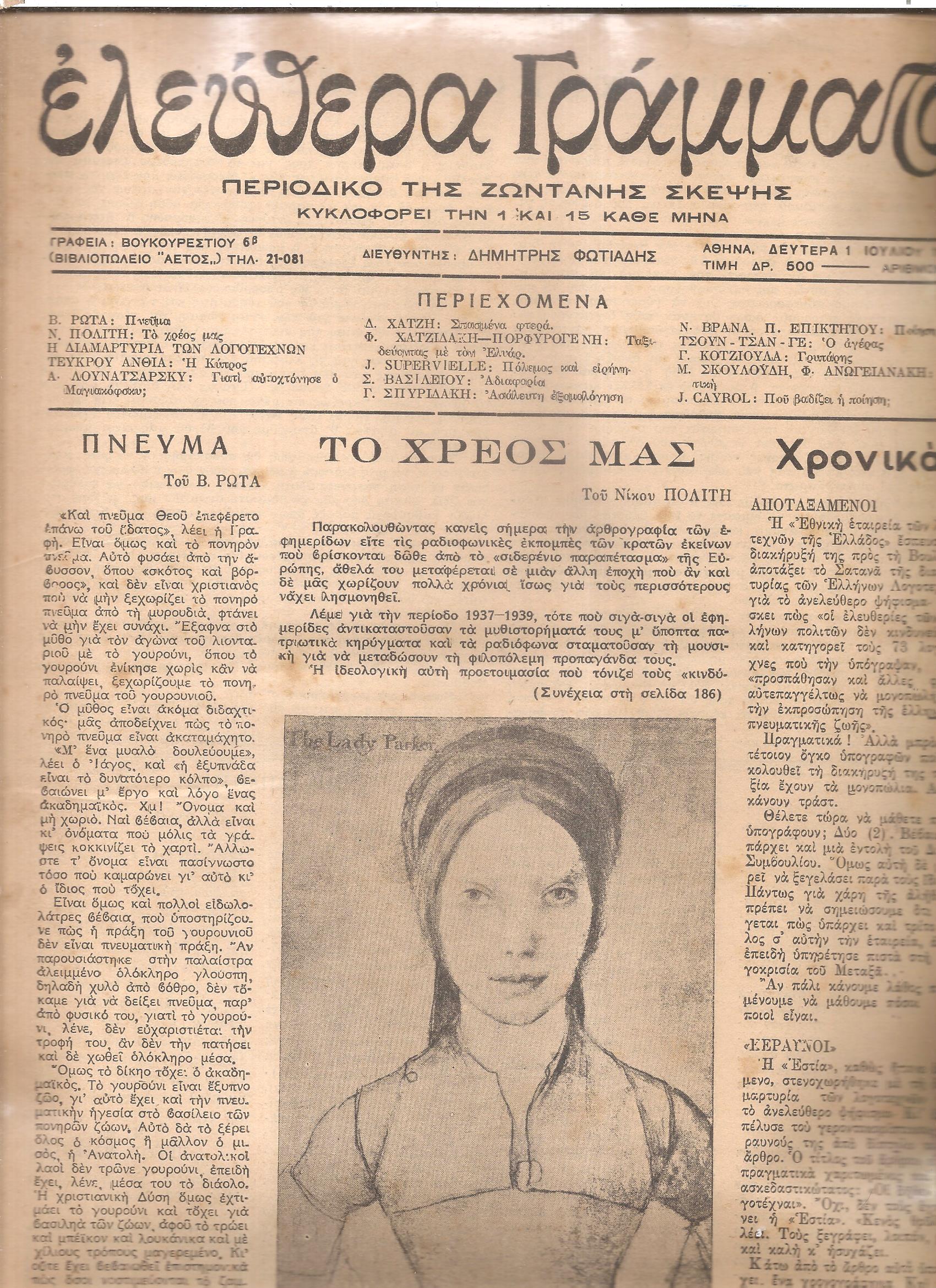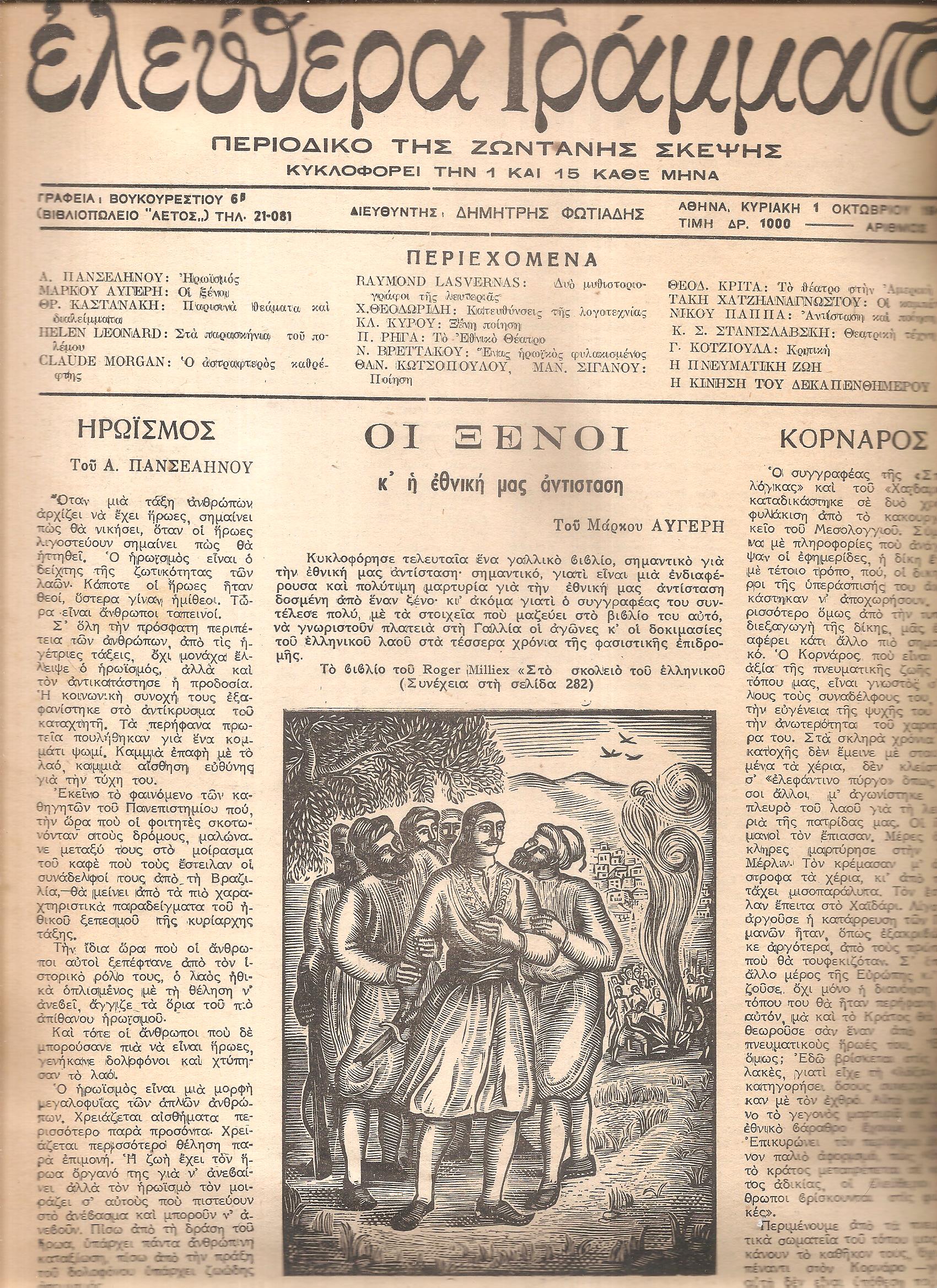 ΕΛΕΥΘΕΡΑ ΓΡΑΜΜΑΤΑ Περίοδος Α΄, τόμος Β΄, 1946-1947, Περιοδικό της ζωντανής σκέψης-κυκλοφορεί κάθε Παρασκευή. Διευθυντής: Δημήτρης Φωτιάδης. Αθήνα 1946-1947, 4ο [25Χ35], (Διαθέτουμε μεμονωμένα τα τεύχη: αρ. 34[4 Ιανοαρίου 1946], σ. 16, αρ. 35[25 Ιανουαρίου 1946], σ. 17-32, αρ. 36[8 Φεβρουαρίου 1946], σ.33-40, αρ. 37[22 Φεβρουαρίου 1946], σ.41-56, αρ. 38[8 Μαρτίου 1946], σ.57-72, αρ. 39[22 Μαρίου 1946], σ. 73-88, αρ. 40[5 Απριλίου 1946], σ. 89-104, αρ. 41[19 Απριλίου 1946], σ. 105-120, αρ. 42[1 Μαΐου 1946], σ. 121-136, αρ. 43[15 Μαΐου 1946], σ. 137-152, αρ. 44[1 Ιουνίου 1946], σ. 153-168, αρ. 45[15 Ιουνίου 1946], σ. 169-184, αρ. 47[15 Ιουλίου 1946], σ. 201-216, :, αρ. 48[1 Αυγούστου 1946], σ. 217-232, αρ. 49[15 Αυγούστου 1946], σ. 233-248, αρ. 50[1 Σεπτεμβρίου 1946], σ. 249-264, αρ. 51[15 Σεπτεμβρίου 1946], σ. 265-280, αρ. 54[1 Νοεμβρίου 1946], σ. 313-328, αρ. 55[15 Νοεμβρίου 1946], σ. 329-344, αρ. 58[1 Ιανουαρίου 1947], σ. 16+4χ.α.[περιεχόμενα Β΄τόμου], αρ. 60[15 Φεβρουαρίου 1947], σ. 33-48, αρ. 61[1 Μαρτίου 1947], σ. 49-64, αρ. 62[15 Μαρτίου 1947], σ. 65-80, αρ. 64[12 Απριλίου 1947], σ. 97-112). Μερικά τεύχη ταλαιπωρημένα, έχει γίνει συντήρηση. ΄Εκαστο τεύχος € 6,36/5,09 Με κόκκινο όσα τεύχη έχουν πουληθεί