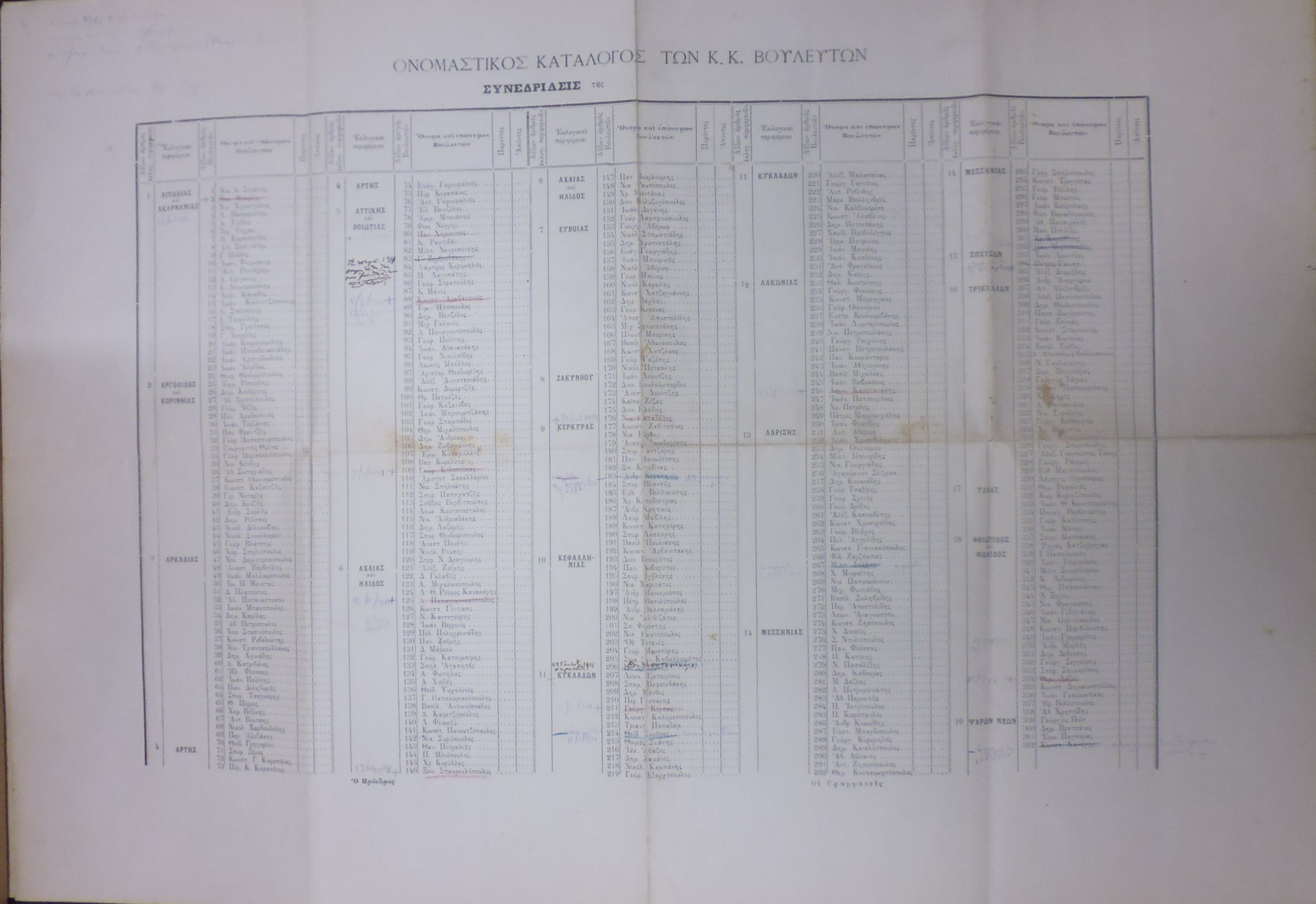 Αλφαβητικός κατάλογος των κυρίων Βουλευτών της Β΄ διπλής αναθεωρητικής Βουλής, (Εκλογές 28ης Νοεμβρίου 1910). Ο κατάλογος περιλαμβάνει τα ονόματα, την εκλογική περιφέρεια και την διεύθυνση κατοικίας των βουλευτών στην Αθήνα και τον Πειραιά. Μονόφυλλο, (75x52 εκ.). [2] Ονομαστικός κατάλογος των κ.κ. Βουλευτών (δίκην παρουσιολογίου), με χειρόγραφες σημειώσεις κυρίως ημερομηνίες και διαγραφές ονομάτων. Μονόφυλλο, (75x52 εκ.). Τεκμήρια 2