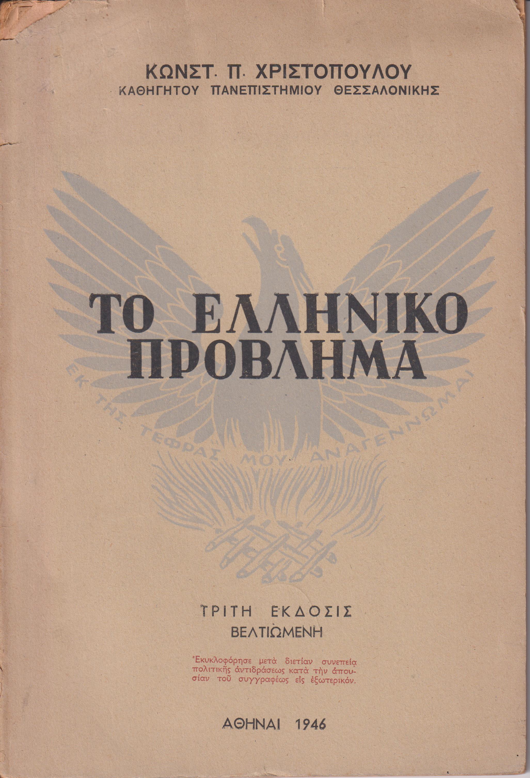 ΧΡΙΣΤΟΠΟΥΛΟΣ Κ., Το ελληνικόν πρόβλημα. Τρίτη έκδοσις βελτιωμένη. Αθήναι 1946, 8o, σελ. 92