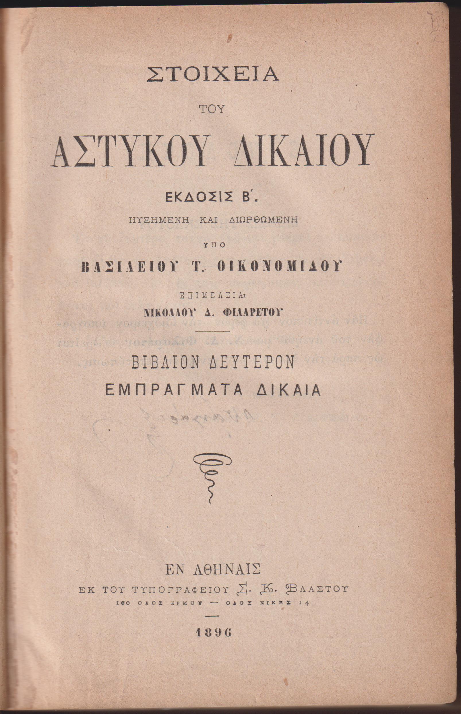 ΟΙΚΟΝΟΜΙΔΗΣ ΒΑΣΙΛΕΙΟΣ Τ., Στοιχεία του Αστυκού Δικαίου, βιβλίον πρώτον Γενικαί Αρχαί, Έκδοσις B΄ Ηυξημένη και διωρθωμένη. Επιμελεία Νικολάου Δ. Φιλαρέτου. Εν Αθήναις 1893, ΕΚ ΤΟΥ ΤΥΠΟΓΡΑΦΕΙΟΥ ΑΛΕΞ. ΠΑΠΑΓΕΩΡΓΙΟΥ, 8ο, σελ. η΄+488 [μαζί] ΟΙΚΟΝΟΜΙΔΗΣ ΒΑΣΙΛΕΙΟΣ Τ., Στοιχεία του Αστυκού Δικαίου, βιβλίον δεύτερον Εμπράγματα Δίκαια, Έκδοσις B΄ Ηυξημένη και διωρθωμένη. Επιμελεία Νικολάου Δ. Φιλαρέτου. Εν Αθήναις 1896, ΕΚ ΤΟΥ ΤΥΠΟΓΡΑΦΕΙΟΥ Σ. Κ. ΒΛΑΣΤΟΥ, 8ο, σελ. η΄+583 (Ο πρώτος τόμος έχει πολύ ταλαιπωρημένη βιβλιοδεσία και λείπει η ράχη, αποκολλημένες μερικές σελίδες. Στον δεύτερο τόμο αποκολλημένο ένα μέρος της ράχης ΗΛΙΟΥ-ΠΟΛΕΜΗ αρ. 1893.781 και ΗΛΙΟΥ-ΠΟΛΕΜΗ αρ. 1896.965)