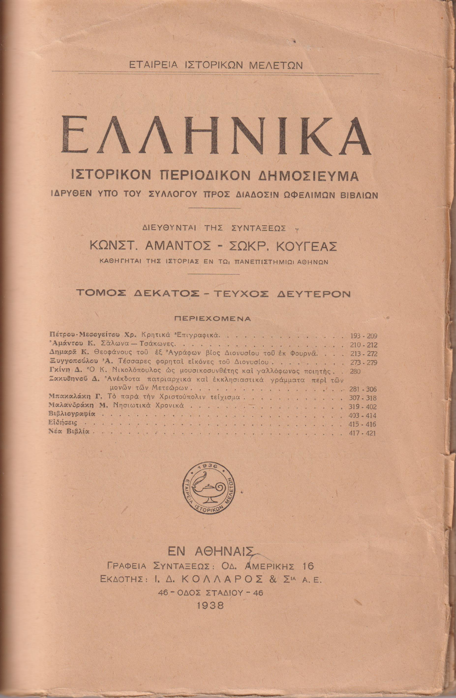 ΕΛΛΗΝΙΚΑ έτος Ι΄ 1938, τεύχη 1-2, Ιστορικόν Περιοδικόν Δημοσίευμα. Εκδιδόμενον καθ’εξάμηνον. Διευθυνταί της συντάξεως : ΚΩΝΣ. ΑΜΑΝΤΟΣ –ΣΩΚΡ. ΚΟΥΓΕΑΣ . Εν Αθήναις 1938, 8ο, σελ. 192+[193]-423+1λ+4πιν. (τα δύο τεύχη με τα εξώφυλλά τους μαζί ενωμένα με θερμοκόλληση).ΠΛΗΡΗΣ ΤΟΜΟΣ