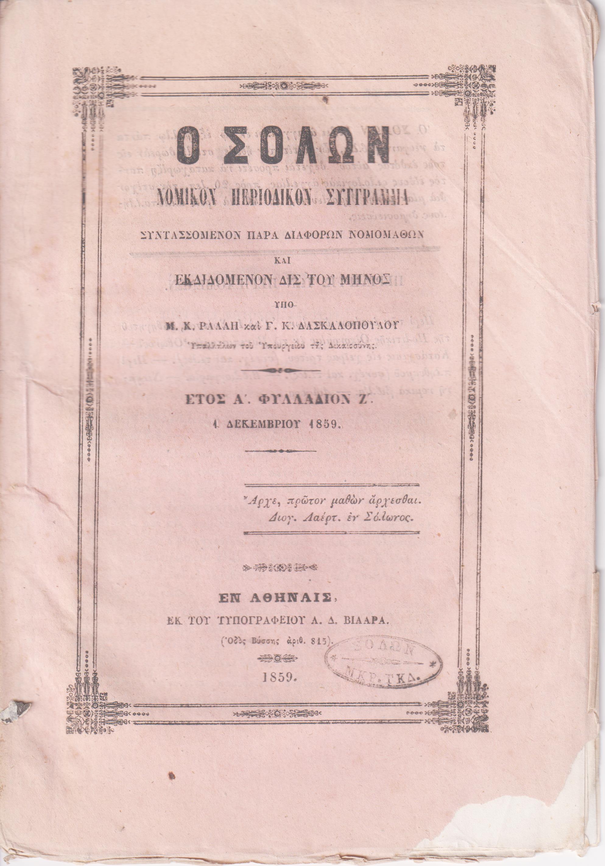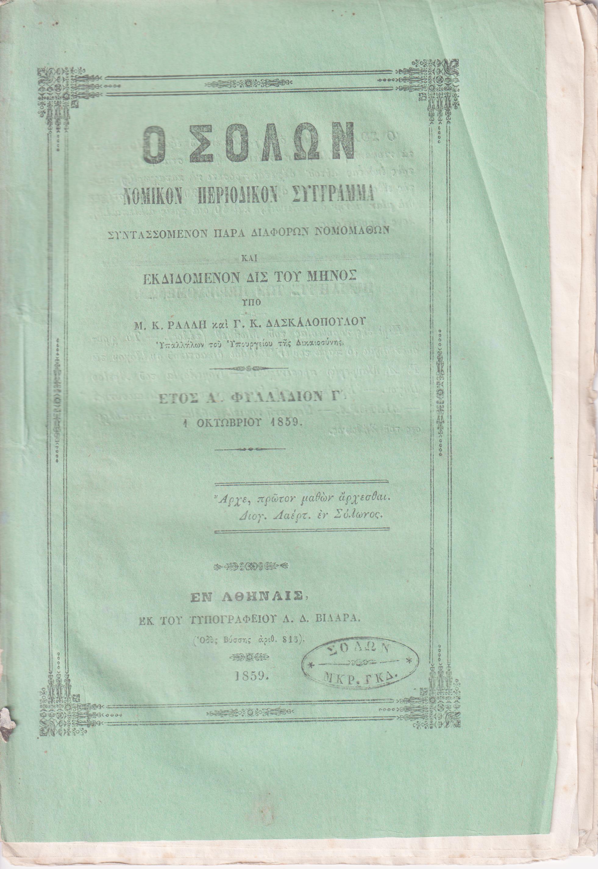 ΣΟΛΩΝ [Ο] 1859-1860, Νομικόν περιοδικόν σύγγραμμα συντασσόμενον παρά διαφόρων Νομομαθών και εκδιδόμενον δις του μηνός υπό Μ. Κ. ΡΑΛΛΗ και Γ. Κ. ΔΑΣΚΑΛΟΠΟΥΛΟΥ . Εν Αθήναις, ΕΚ ΤΟΥ ΤΥΠΟΓΡΑΦΕΙΟΥ Α. Δ. ΒΙΛΑΡΑ, 1859-1860, 8ο (Διαθέσιμα τα τεύχη: ΄Ετος Α΄, φυλλάδιον Β΄[15/9/1859], σελ. 33-64, φυλλ. Γ΄[1/10/1859], σ. 65-96, φυλλ. Δ΄[15/10/1859], σ. 97-128, φυλλ. Ε΄[1/11/1859], σ. 129-160, φυλλ. ΣΤ΄[15/11/1859], σ. 161-192, φυλλ. Ζ΄[1/12/1859], σ. 193-224, φυλλ. Θ΄ [1/1/1860], σ. 257-280, φυλλ. ΙΑ΄ [1/2/1860], σ. 313-344). ΄Όλα τα τεύχη με τα εξώφυλλά τους, σε καλή κατάσταση. ΄Εκαστο τεύχος € 10,60/7,42