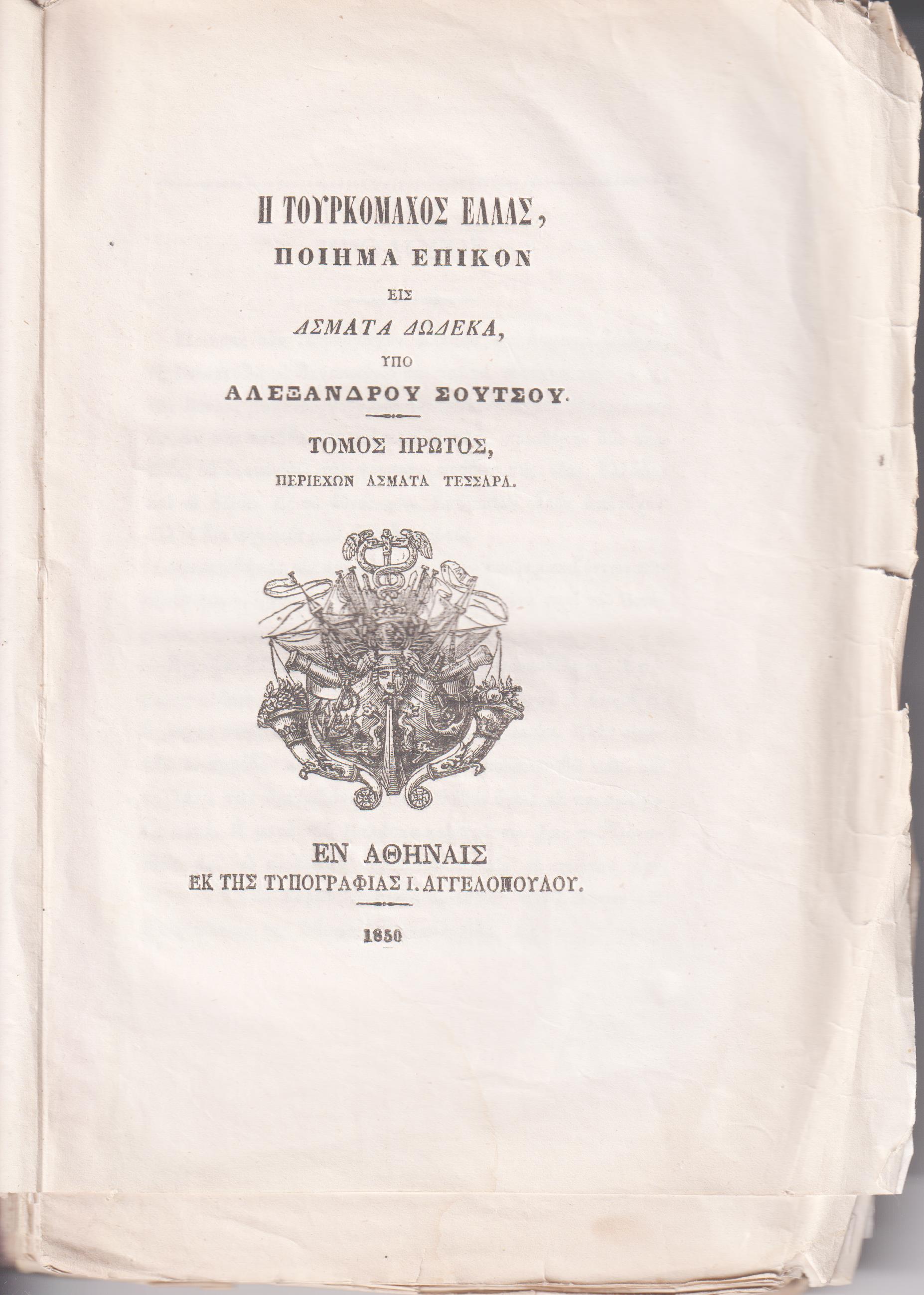 ΣΟΥΤΣΟΣ ΑΛΕΞΑΝΔΡΟΣ, Η Τουρκομάχος Ελλάς. Ποίημα επικόν εις άσματα δώδεκα. Τόμος Α΄ , περιέχων άσματα τέσσαρα. Εν Αθήναις, ΕΚ ΤΗΣ ΤΥΠΟΓΡΑΦΙΑΣ Ι. ΑΓΓΕΛΟΠΟΥΛΟΥ, 1850, 8ο, σελ. 2λ+ιδ΄+255+1λ (δεν κυκλοφόρησε άλλος τόμος, άδετο, λείπει το οπισθόφυλλο, αρκετά καλή κατάσταση. Είναι η 1η έκδοση από τις 6 εκδόσεις του 19ου αιώνα, ΓΚΙΝΗΣ ΜΕΞΑΣ αρ. 5198)