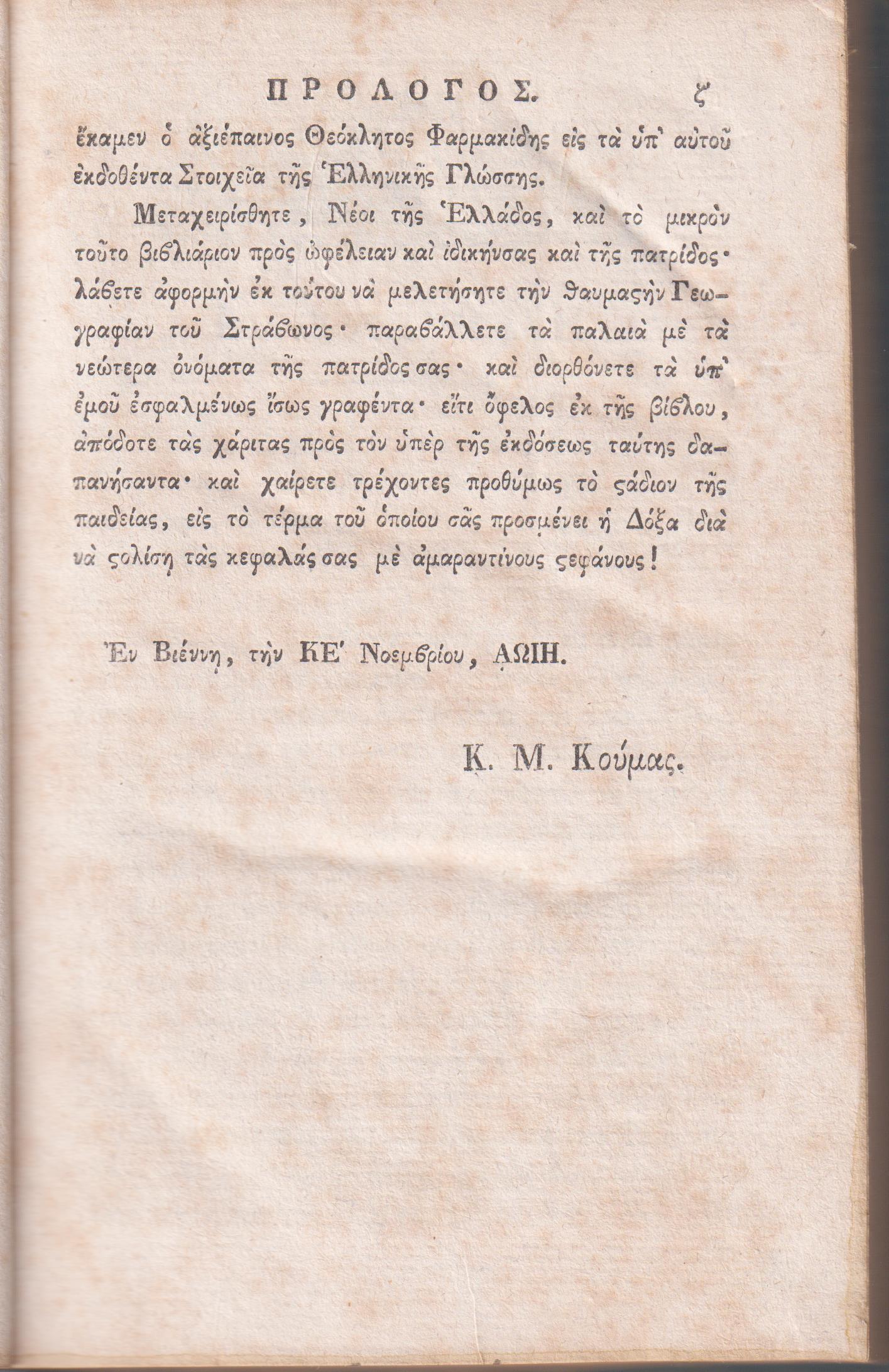 ΚΟΥΜΑΣ Κ. Μ., Σύνοψις της Παλαιάς Γεωγραφίας. Μεταφρασθείσα μεν εκ του Γερμανικού εις χρήσιν του Φιλολογικού της Σμύρνης Γυμνασίου. Εκδοθείσα δε διά φιλοτίμου δαπάνης Π. Νικολαΐδου Σμυρναίου. Εν Βιέννη της Αυστρίας, εκ της Τυπογραφίας Ιωάννου Σνειρέρου, ΑΩΙΘ΄(1819), 8ο, σελ. ζ΄+1λ+192 (λείπουν οι τρεις πίνακες στο τέλος, βιβλιοδεσία εποχής ταλαιπωρημένη, οξειδώσεις σε αρκετές σελίδες, ΓΚΙΝΗΣ-ΜΕΞΑΣ αρ. 1198, ΗΛΙΟΥ αρ. 1819.127)