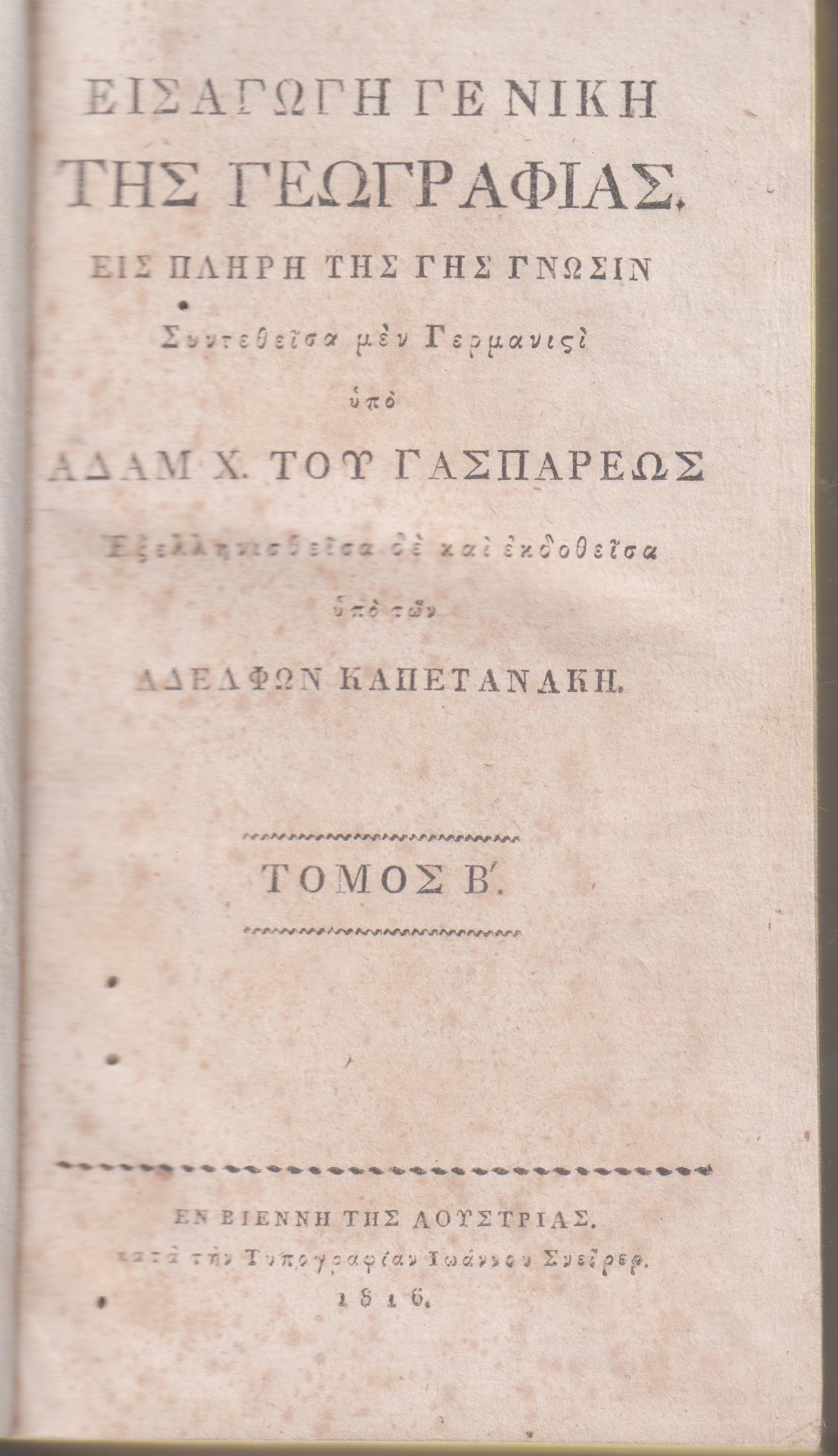 ΓΑΣΠΑΡΕΩΣ ΑΔΑΜ. Χ., Εισαγωγή Γενική της Γεωγραφίας. Εις πλήρη της γης γνώσιν. Τόμοι Α΄-Β΄. Εξελληνισθείσα υπό των Αδελφών Καπετανάκη. Εν Βιέννη της Αουστρίας, κατά την Τυπογραφίαν Ιωάννου Σνείρερ, 1816, 8ο, τ. Α΄, σελ. φ.1 +θ΄+1λ+415+1λ+πίν., τ. Β΄, φ.1+416+δ΄+16χ.α.[κατάλογος Συνδρομητών] +4χ.α.[Προκήρυξις Αδελφών Καπετανάκη.Εν Βιέννη της Αουστρίας 1816 τη 1 Ιουλίου] (οι δύο τόμοι δεμένοι με διαφορετική βιβλιοδεσία εποχής πολύ ταλαιπωρημένη κυρίως ο΄τ. Α΄. Στον τόμο Α΄ μειονεκτήματα: οξειδώσεις στο χαρτί και σητόβρωτο στις περισσότερες σελίδες κυρίως μικρές τρύπες στα κάτω περιθώρια, εκτός από σελ. 193-221 [1χιλιοστ.Χ6εκατ.] που επηρεάζεται και το κείμενο, στον τόμο Β΄, οξειδώσεις στο χαρτί, και γενικά σε καλύτερη κατάσταση, τ. Α΄ ΗΛΙΟΥ 1816.31 & τ. Β΄1816.32)