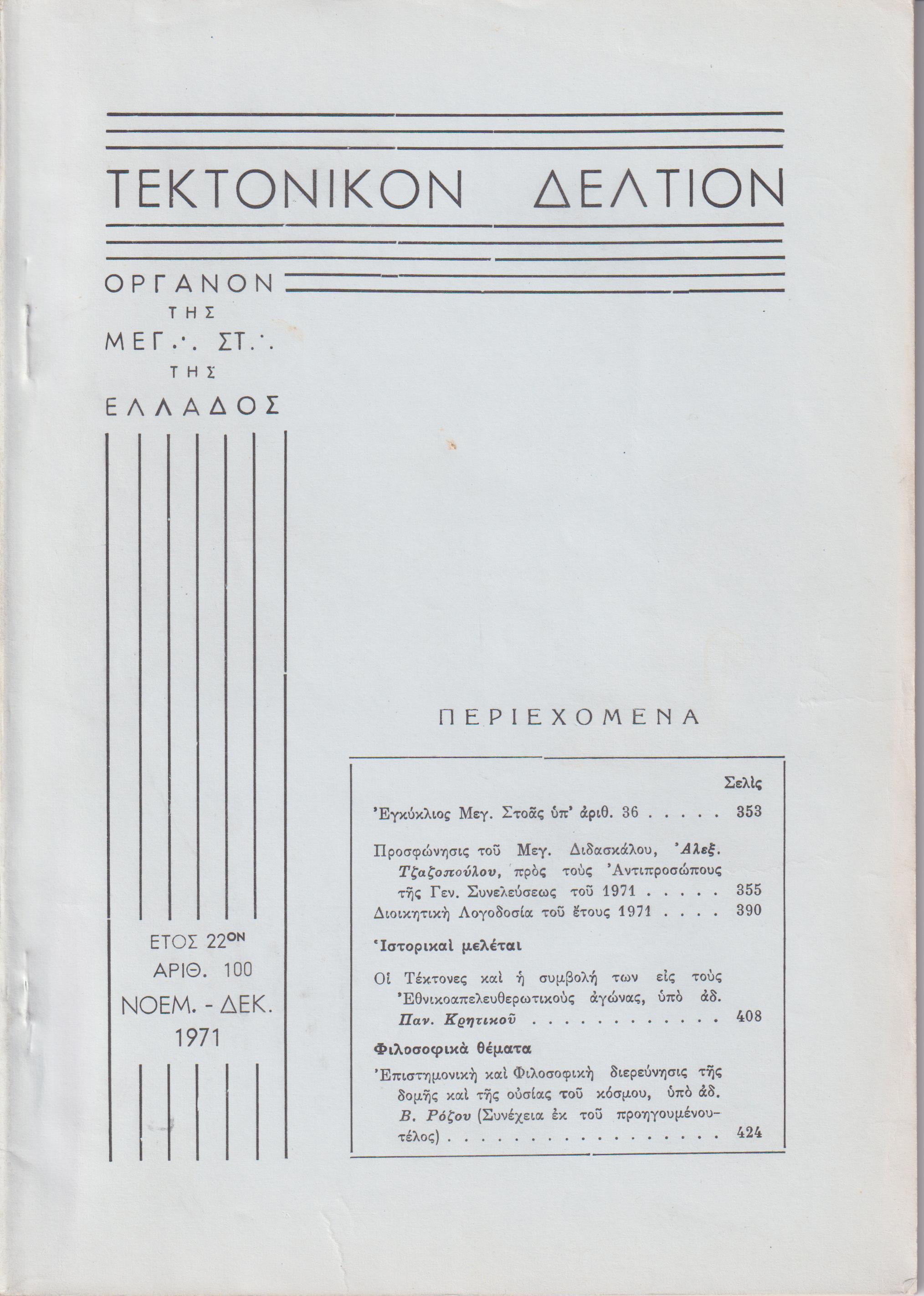 ΤΕΚΤΟΝΙΚΟΝ ΔΕΛΤΙΟΝ, 1971, έτος 22ον, ΄Οργανον της Μεγάλης Στοάς της Ελλάδος. Υπεύθυνος: Ε. ΜΑΚΡΥΜΙΧΑΛΟΣ. Συντακτ. Επιτροπή: Π. Γ. ΚΡΗΤΙΚΟΣ, Ν. ΜΗΛΙΩΡΗΣ, Φ. ΦΑΛΜΠΟΣ, Α. ΖΕΡΒΟΥΔΑΚΗΣ, Ξ. ΧΑΤΖΗΣΑΡΑΝΤΟΣ. Αθήναι 1971, 8ο, σελ. 448, αρ.95[Ιαν.-Φεβρ. 1971, σελ. 88], αρ. 99[Σεπτ.-Οκτ. 1971, σελ. 257- 352], αρ. 100[Νοέμ..-Δεκ. 1971, σελ. 353-448]. Λείπουν τα τεύχη 96-98