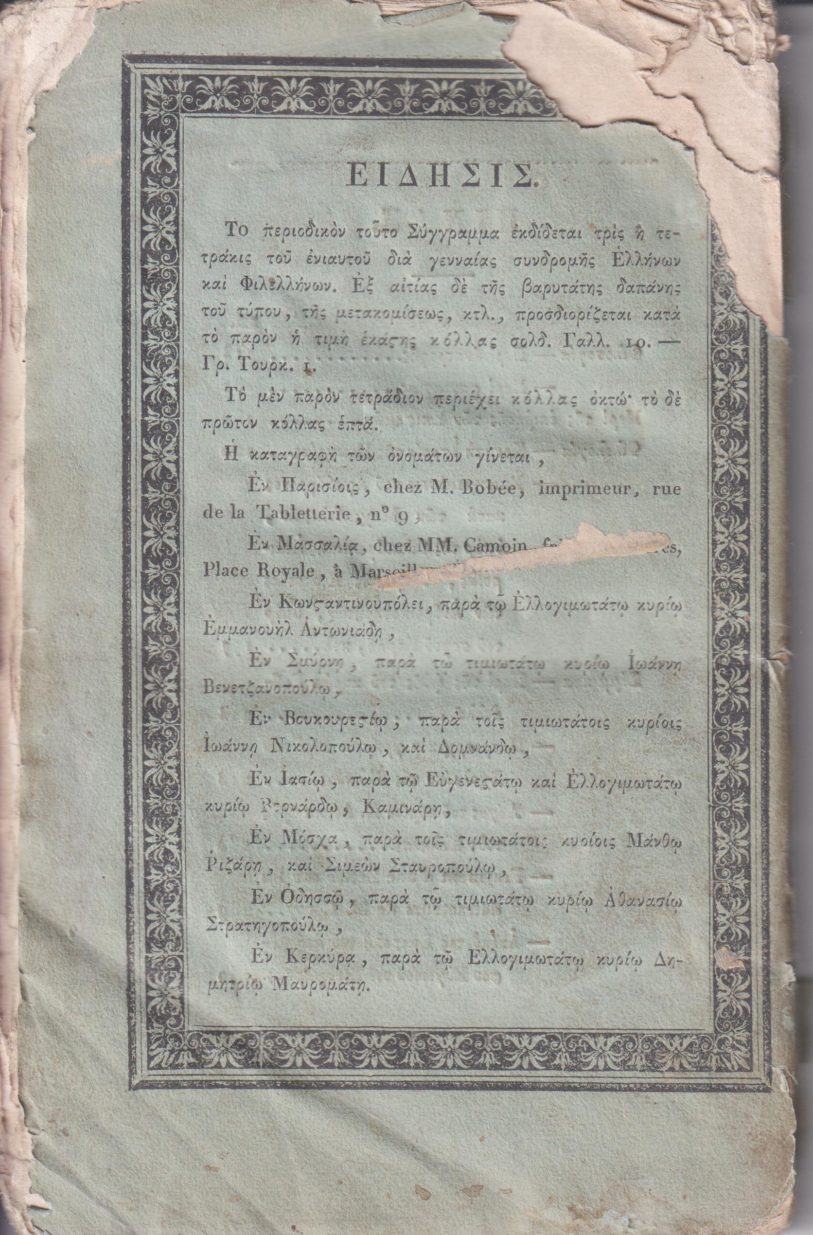 ΜΕΛΙΣΣΑ ή ΕΦΗΜΕΡΙΣ ΕΛΛΗΝΙΚΗ, Τετράδια Α΄& Β΄(μόνο), Εκδιδομένη υπό Σ. Κονδού Κερκυραίου… Εν Παρισίοις 1819-1820, ΕΚ ΤΗΣ ΤΥΠΟΓΡΑΦΙΑΣ ΤΟΥ Α. ΒΟΒΑΙΟΥ,8ο. Τετράδιον Α΄, σελ. φ. 2+η΄+[13]-112 (λείπει το εμπροσθόφυλλο, άκοπα φύλλα από σελ. 25-96). Τετράδιον Β΄, σελ. 113-242 +2χ.α.  (η σελίδα τίτλου λείπει; αντίτυπο ταλαιπωρημένο, ίχνη υγρασίας  σε όλες τις σελίδες[μονές-ζυγές στο κάτω μέρος)