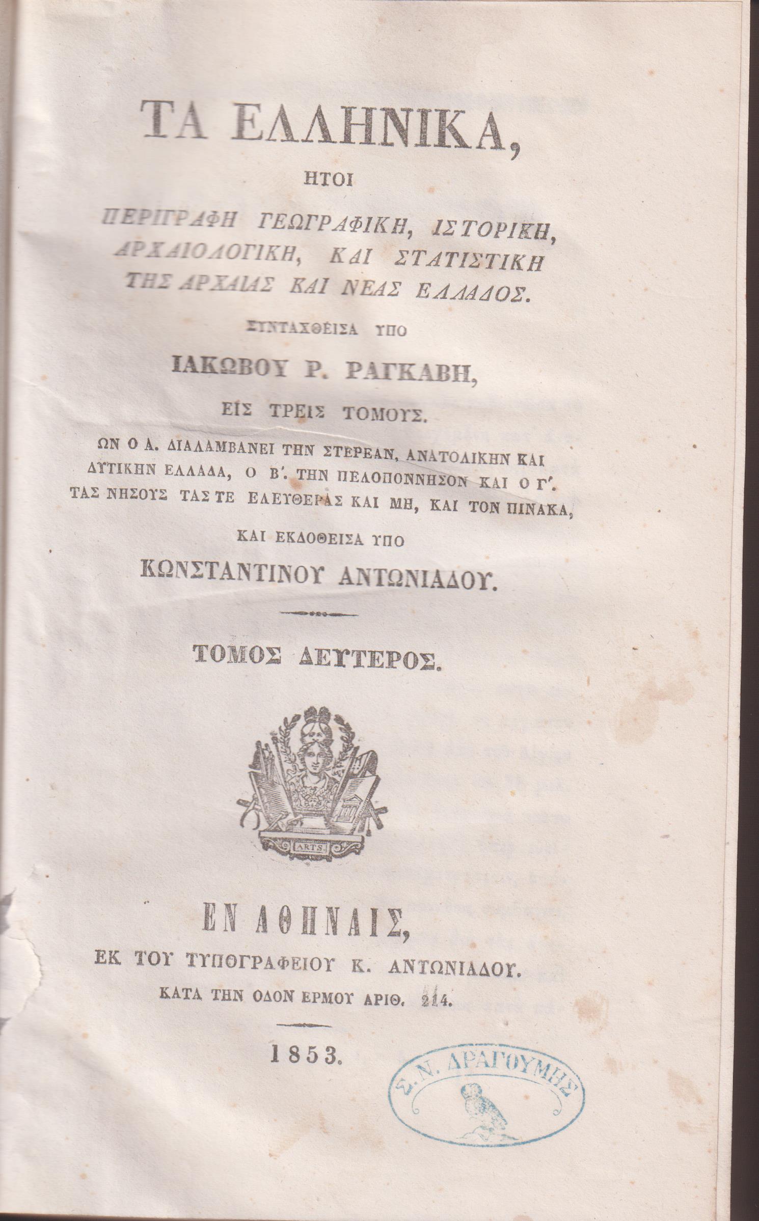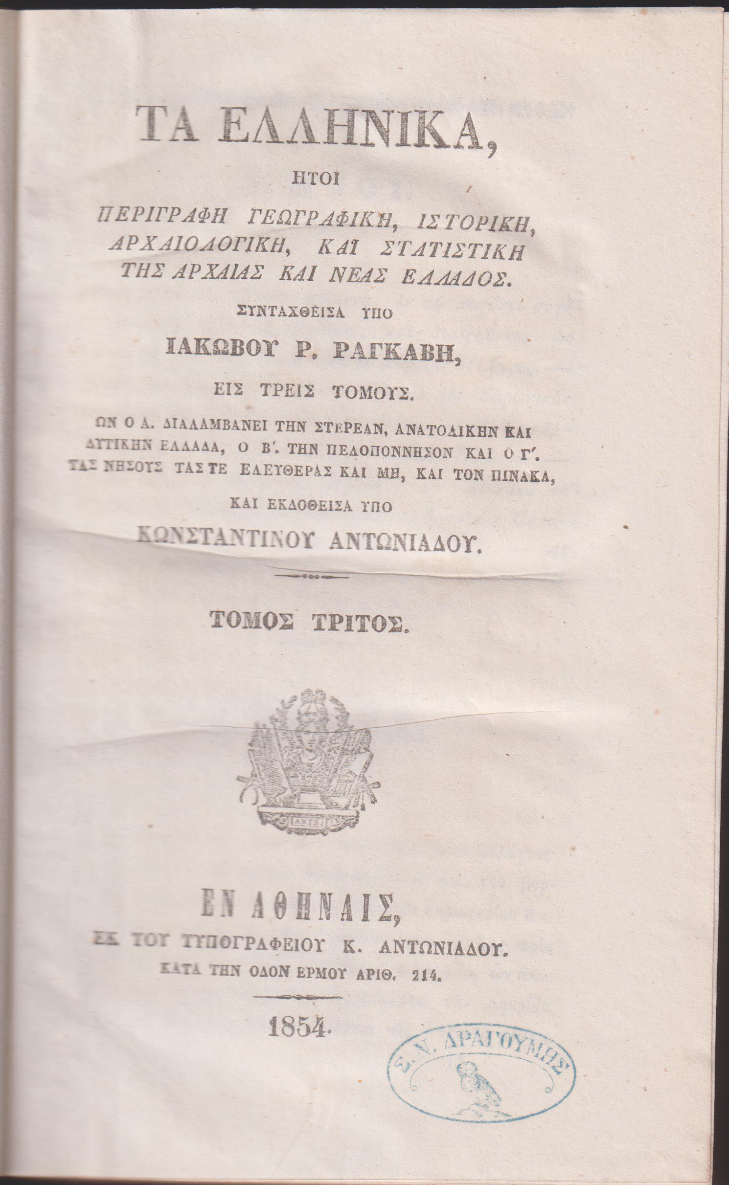 ΡΑΓΚΑΒΗΣ ΙΑΚΩΒΟΣ Ρ., Τα Ελληνικά (τόμοι 1-3) ήτοι Περιγραφή Γεωγραφική, Ιστορική, Αρχαιολογική, και Στατιστική της Αρχαίας και Νέας Ελλάδος. Εις τρεις τόμους. Ων ο Α΄. Διαλαμβάνει την Στερεάν, Ανατολικήν και Δυτικήν Ελλάδα, ο Β΄. Την Πελοπόννησον και ο Γ΄. Τας Νήσους τας τε ελευθέρας και μη, και τον πίνακα, και εκδοθείσα υπό Κωνσταντίνου Αντωνιάδου. Τόμος 1ος . Εν Αθήναις ΕΚ ΤΟΥ ΤΥΠΟΓΡΑΦΕΙΟΥ Κ. ΑΝΤΩΝΙΑΔΟΥ, 1853, 8ο, σελ. ι΄+784 (ΒΕΦΗ αρ. 1853.347 & ΓΚΙΝΗΣ-ΜΕΞΑΣ αρ. 6135). Τόμος 2ος . Εν Αθήναις ΕΚ ΤΟΥ ΤΥΠΟΓΡΑΦΕΙΟΥ Κ. ΑΝΤΩΝΙΑΔΟΥ, 1853, 8ο, σελ. 736 (ΒΕΦΗ αρ. 1853.348 & ΓΚΙΝΗΣ-ΜΕΞΑΣ αρ. 6135). Τόμος 3ος . Εν Αθήναις ΕΚ ΤΟΥ ΤΥΠΟΓΡΑΦΕΙΟΥ Κ. ΑΝΤΩΝΙΑΔΟΥ, 1854, 8ο, σελ. 791[799]+1λ (ΒΕΦΗ αρ. 1854.237 & ΓΚΙΝΗΣ-ΜΕΞΑΣ αρ. 6354). Οι τρεις τόμοι δερματόδετοι, βιβλιοδεσία νεότερη, χωρίς τα εξώφυλλα. Περιεχόμενο & βιβλιοδεσία σε αρίστη κατάσταση
