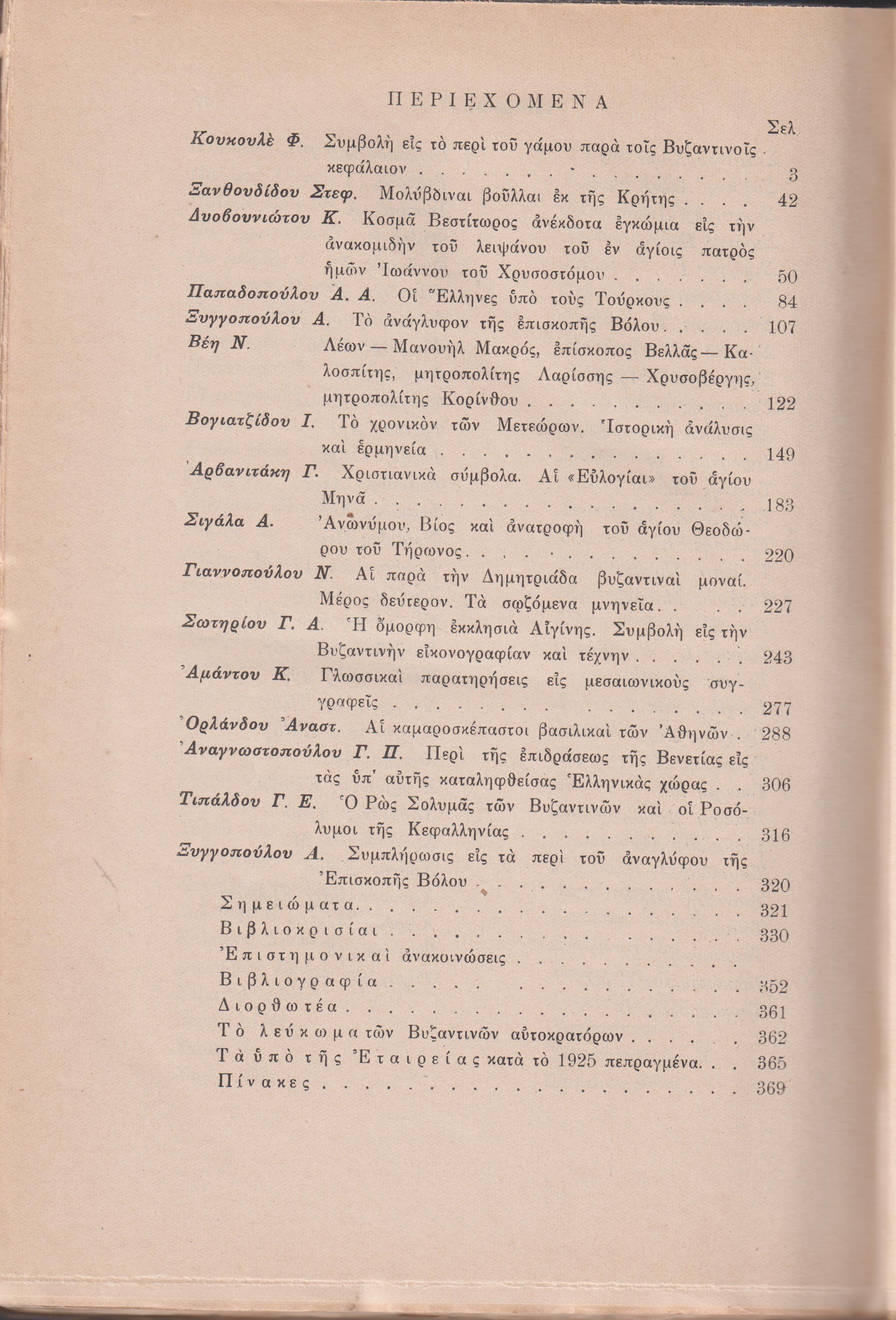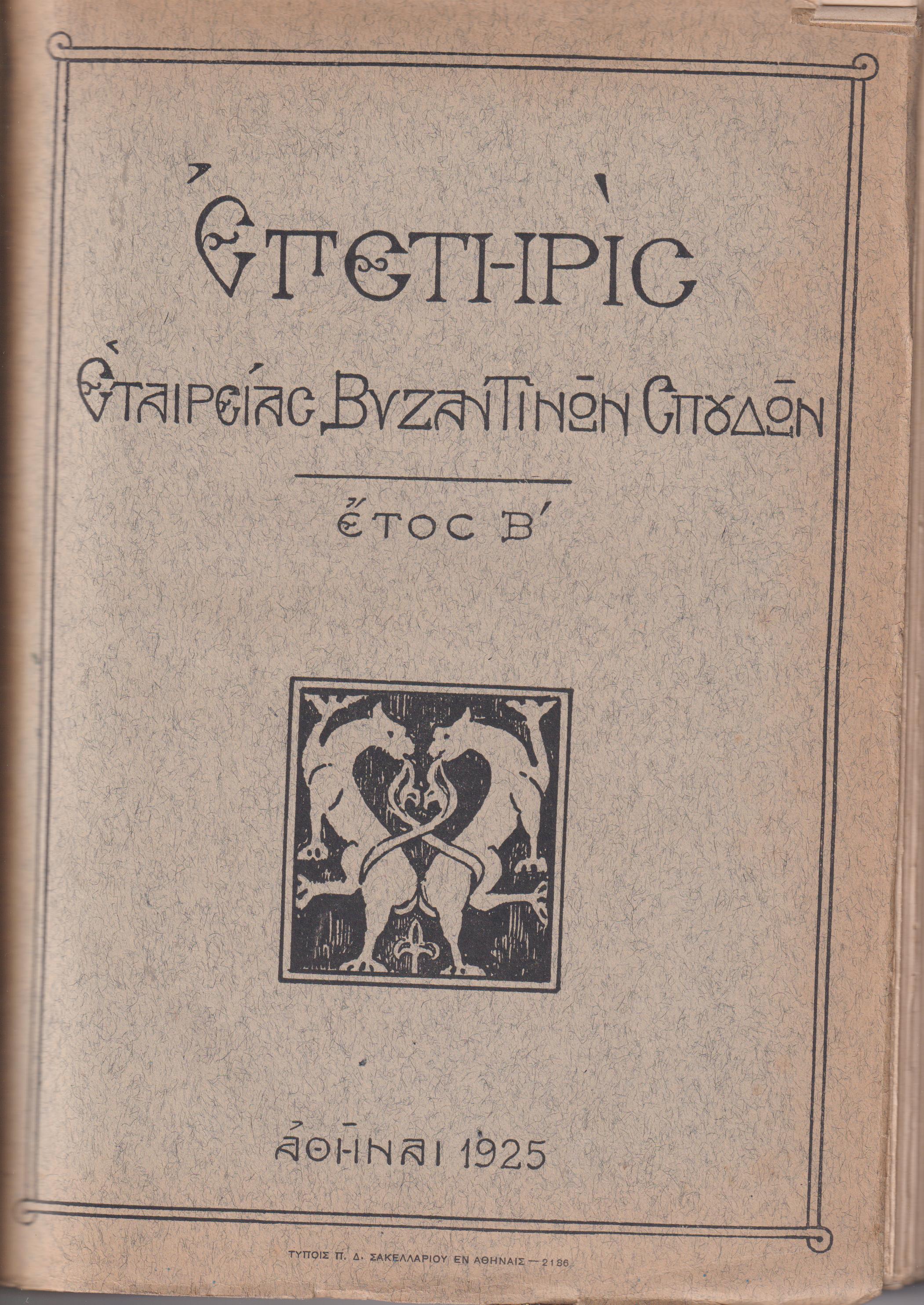 ΕΠΕΤΗΡΙΣ ΕΤΑΙΡΕΙΑΣ ΒΥΖΑΝΤΙΝΩΝ ΣΠΟΥΔΩΝ, έτη Α΄+Β΄. Αθήναι 1924-1925, 8ο, σελ. 383+1λ+382+2λ (τα δύο έτη δεμένα σ’ ένα τόμο λινόδετο με τα εξώφυλλά τους, τα φύλλα άκοπα, βιβλιοδεσία λίγο ταλαιπωρημένη)