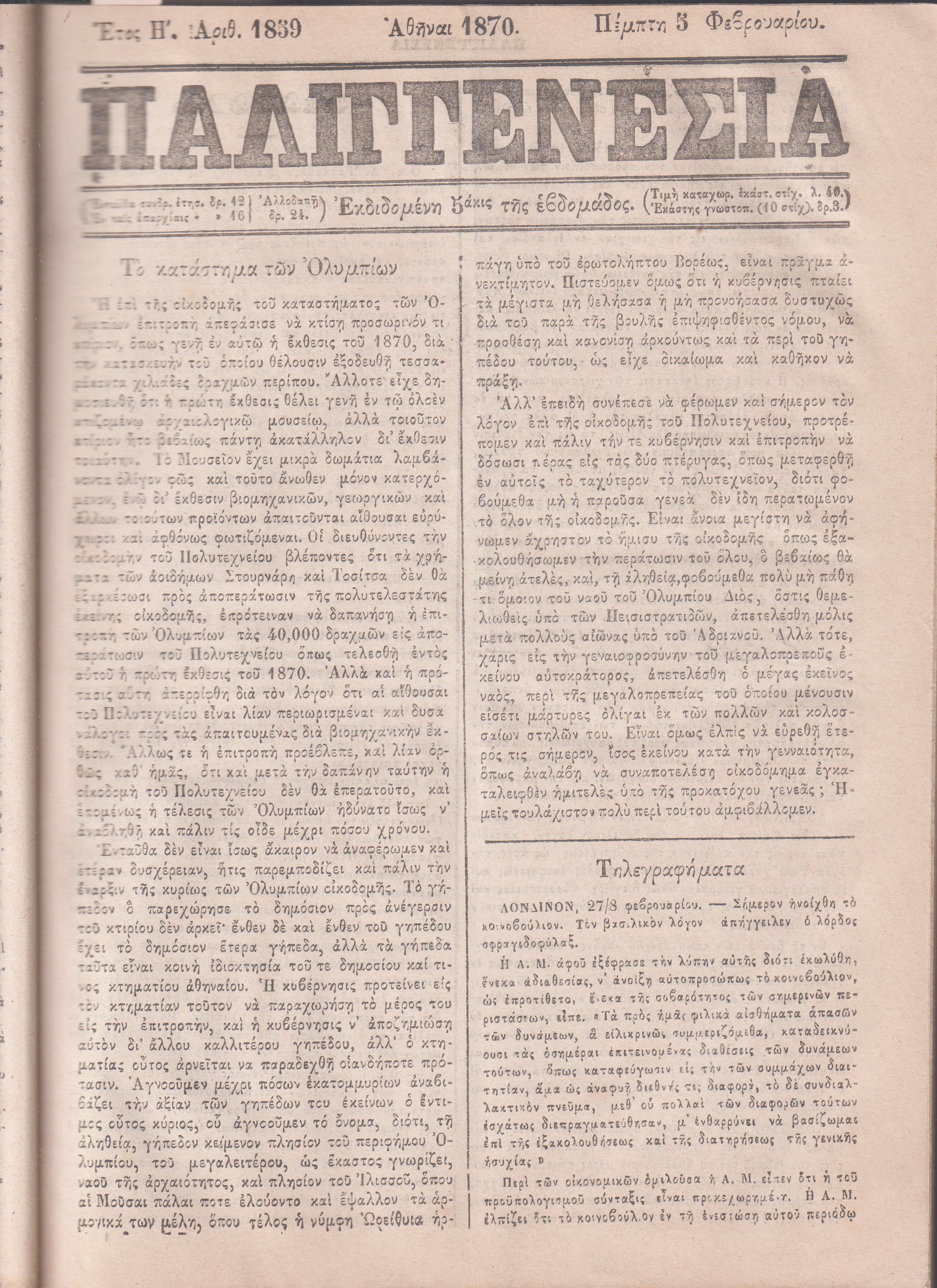 ΠΑΛΙΓΓΕΝΕΣΙΑ 1870, έτος Η΄+Θ΄, Εκδιδομένη 5άκις της εβδομάδος