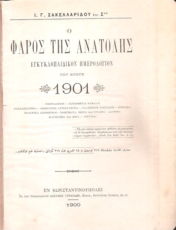 ΣΑΚΕΛΛΑΡΙΔΟΥ Ι.Γ. και Σας , Ο ΦΑΡΟΣ ΤΗΣ ΑΝΑΤΟΛΗΣ , εγκυκλοπαιδικόν ημερολόγιον του έτους 1901 . Εν Κων/πόλει 1900, 8ο, σελ. 480 (βιομηχ. βιβλιοδεσία εποχής εκδότου , σελ. 480+ 13 ένθετα φύλλα διαφημίσεις). Μειονέκτημα: σελ. 48-64 ραμμένες σε λάθος θέση , πλήρες αντίτυπο)