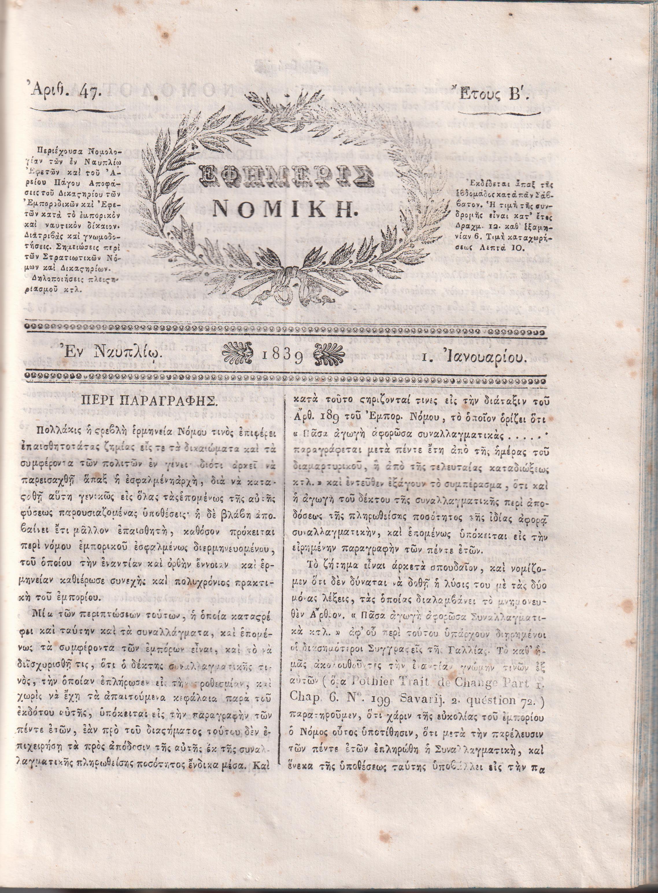 ΕΦΗΜΕΡΙΣ ΝΟΜΙΚΗ 1837-1839, ΄Ετη Α΄-Β΄ , Περιέχουσα Νομολογίαν των εν Ναυπλίω Εφετών, και του Αρείου Πάγου. Αποφάσεις του Δικαστηρίου των Εμποροδικών και Εφετών κατά το εμπορικόν και ναυτικόν δίκαιον. Διατριβάς και γνωμοδοτήσεις. Σημειώσεις περί των Στρατιωτικών Νόμων και Δικαστηρίων. Δηλοποιήσεις πλειστηριασμού. Εκδίδεται άπαξ της εβδομάδος κατά παν Σάββατον. Εν Ναυπλίω 1837-1839, 4ο[19χ26εκ.], σελ. 598+ΚΒ΄+[623]-1010+ΛΒ΄. (΄Ετος Α΄[1837-1838] άρ. 1[9 Οκτωβρίου 1837]έως αρ. 46[3 10βρίου 1838], σελ. 598+ΚΒ΄[Πίναξ αλφαβητικός και αναλυτικός]. ΄Ετος Β΄[1839], τεύχη αρ. 47[1 Ιανουαρίου 1839] έως αρ. 92[9 10βρίου 1839], σελ. φ.1+[623]-1010+ΛΒ΄ [Πίναξ αλφαβητικός και αναλυτικός]. Τα δύο έτη (Α΄+Β΄) δεμένα σένα τόμο, βιβλιοδεσία εποχής ταλαιπωρημένη. Η ράχη αποκολλημένη από το κυρίως σώμα και τα καπάκια της βιβλιοδεσίας χαλαρά. Σε πολλά φύλλα οξειδώσεις στο χαρτί, ίχνη υγρασίας από το 1ο μέχρι το 28ο τεύχος. Σημείωση : Στο έτος Α΄[1837]η σελιδαρίθμηση έχει κενά , λείπουν τα παραρτήματα, σε παραβολή με άλλο αντίτυπο παρουσιάζεται το ίδιο πρόβλημα. Το τεύχος αρ. 34 τελειώνει στη σελίδα 408 και το τεύχος 35 πάει πίσω και αρχίζει με σελ. 313, επίσης το τεύχος 35ο τελειώνει σελ. 320 και το τεύχος 36ο αρχίζει σελ. 367)