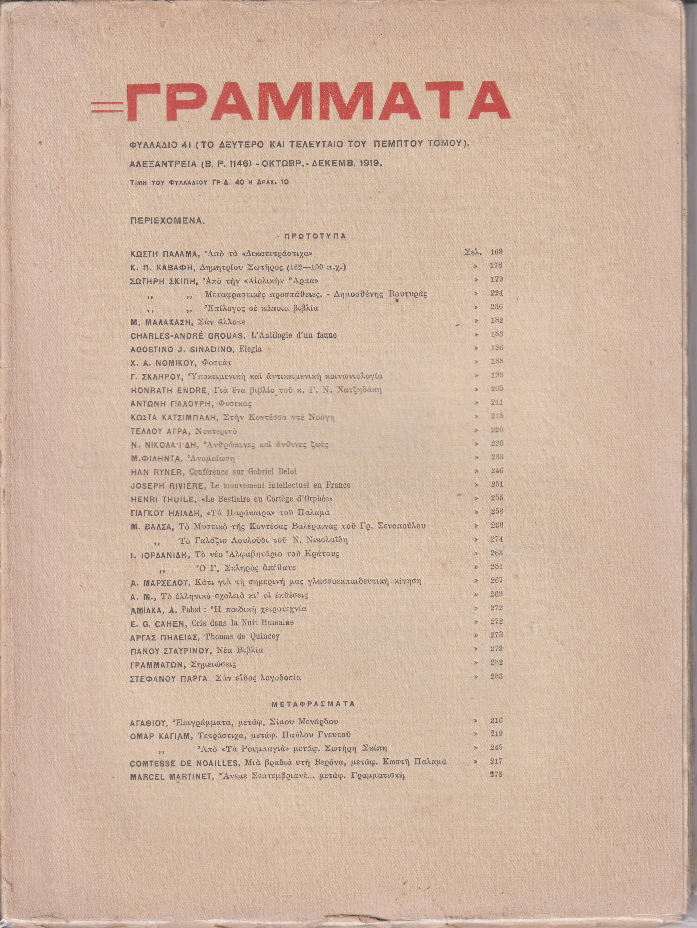 ΓΡΑΜΜΑΤΑ (Αλεξανδρείας), Τόμος Ε΄, φυλλάδια 40 & 41 1919 . Τρίμηνο Λογοτεχνικό Περιοδικό. Εκδότης & Διευθυντής ΣΤΕΦΑΝΟΣ ΠΑΡΓΑΣ . Αλεξάντρεια 1919, 8ο(25,5Χ19), σελ. 284+4χ.α.[περιεχόμενα]+φ.8διαφημ. ( Του πέμπτου τόμου φυλλάδιο 40[Ιούλιος-Σεπτέμ. 1919, 8ο, σελ. 4χ.α.[περιεχόμ.] +168+φ. 4[διαφημίσεις]. Φυλλάδιο 41(Το δεύτερο και τελευταίο του πέμπτου τόμου[Οκτώβρ.-Δεκέμβ. 1919, 8ο, σελ. 169-284+4χ.α.[περιεχόμ.]+φ.4[διαφημίσεις]. Στα δύο τεύχη δημοσιεύματα των : Κ. Π. ΚΑΒΑΦΗ, Κ. Π. Κ., ΣΩΤΗΡΗ ΣΚΙΠΗ, Κ. Δ., Ν. Α. ΚΕΦΑΛΛΗΝΟΥ, Ν. ΝΙΚΟΛΑΪΔΗ, ΜΑΡΚΟΥ ΑΥΓΕΡΗ, ΜΥΡΤΙΩΤΙΣΣΑΣ, Ν. ΧΑΝΤΖΑΡΑ, ΠΕΤΡΟΥ ΜΑΓΝΗ, ΓΛ. ΑΛΙΘΕΡΣΗ, Χ. Α. ΝΟΜΙΚΟΥ, ANDRE SPIRE, PHILEAS LEBESQUE, AGOSTINO J. SINADINO, DANIEL COHEN, ΕΙΡΗΝΗΣ ΔΕΝΔΡΙΝΟΥ, ΘΡΑΣ. ΣΤΑΥΡΑΚΗ, Ε. ΕΛΕΥΘΕΡΙΑΔΗ, Γ.ΣΚΛΗΡΟΥ, Μ. ΦΙΛΗΝΤΑ, ΑΝΤΩΝΗ ΓΙΑΛΟΥΡΗ, ΚΩΣΤΑ ΟΥΡΑΝΗ, Π. ΣΜΥΡΝΙΑΔΗ, ΜΙΛΤ. ΚΡΕΝΔΗΡΟΠΟΥΛΟΥ, ΤΕΛΛΟΥ ΑΓΡΑ, ΚΩΣΤΗ ΠΑΛΑΜΑ, Μ. ΜΑΛΑΚΑΣΗ, ΚΩΣΤΑ ΚΑΤΣΙΜΠΑΛΗ, Μ. ΦΙΛΗΝΤΑ, ΓΙΑΓΚΟΥ ΗΛΙΑΔΗ, Μ. ΒΑΛΣΑ, Ι. ΙΟΡΔΑΝΙΔΗ, Α. ΜΑΡΣΕΛΟΥ, Α. Μ., ΑΜΙΛΚΑ, ΑΡΓΑΣ ΠΗΛΕΙΑΣ, E. G. CAHEN, ΠΑΝΟΥ ΣΤΑΥΡΙΝΟΥ, κ. α. ). Το 1ο τεύχος άκοπα φύλλα, λυτό και ταλαιπωρημένο. Στο 2ο τεύχος(41) λείπει η εικόνα της COMTESSE DE NOAILLES μεταξύ σελ. 216 & 217, λυτό. ΠΛΗΡΗΣ ΤΟΜΟΣ