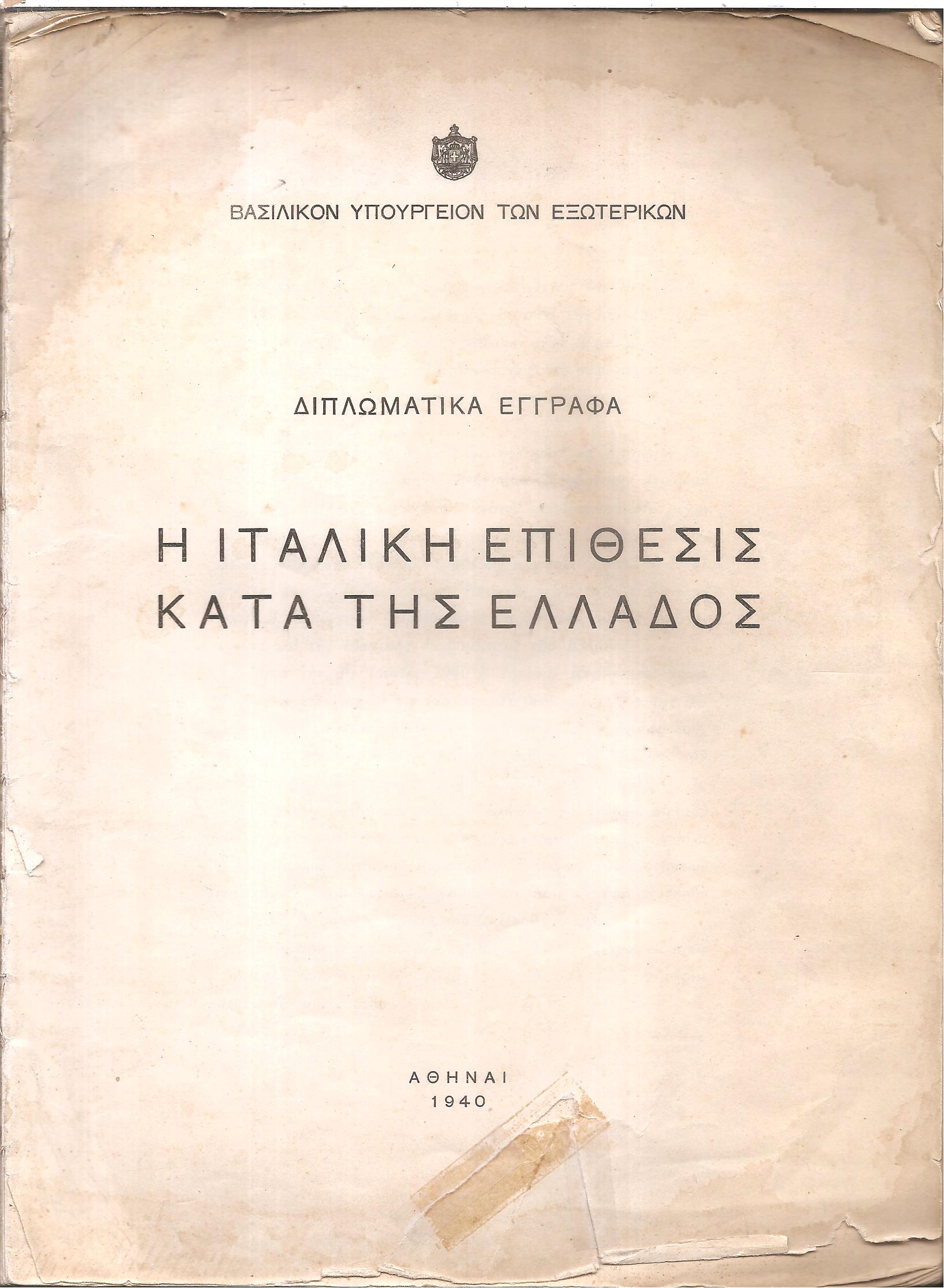 ΒΑΣΙΛΙΚΟΝ ΥΠΟΥΡΓΕΙΟΝ ΤΩΝ ΕΞΩΤΕΡΙΚΩΝ, Διπλωματικά έγγραφα. Η ιταλική επίθεσις κατά της Ελλάδος. Αθήναι 1940, 4o, σ. 151