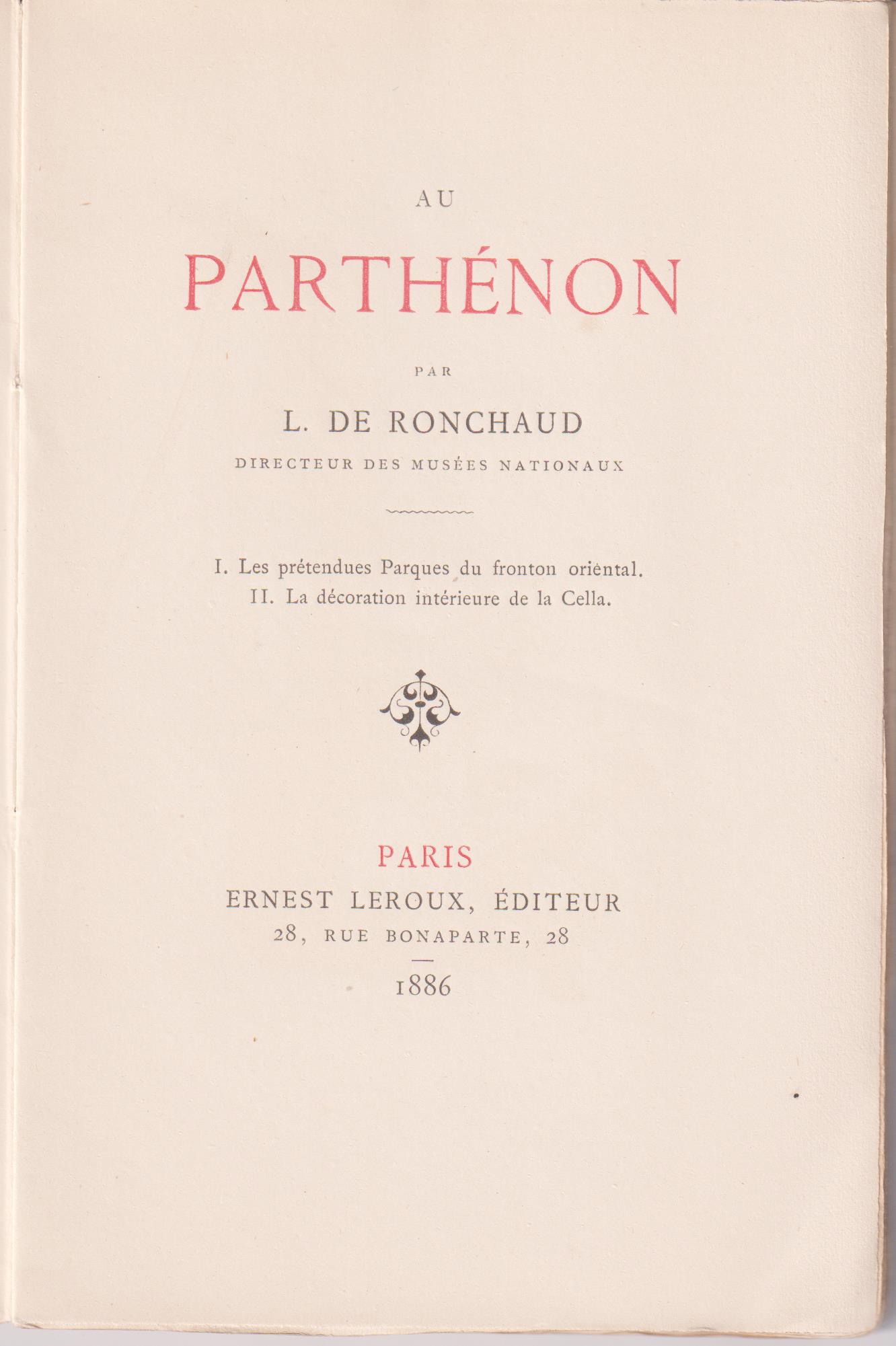 RONCHAUD L.de , Au Parthénon. I. Les prétendues du fronton orièntal. II. La décoration intèrieur de la Cella. Paris 1886, 16ο, σελ.V+1λ+91 (λυτό)