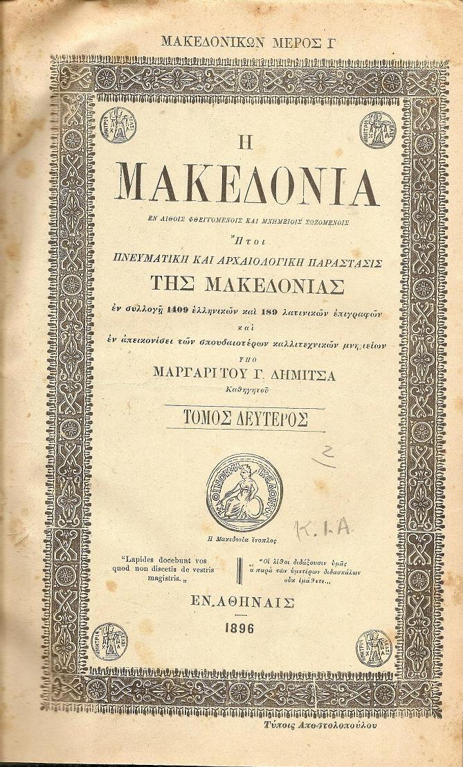 ΔΗΜΙΤΣΑΣ ΜΑΡΓΑΡΙΤΗΣ Γ., Η Μακεδονία εν λίθοις φθεγγομένοις και μνημείοις σωζομένοις ήτοι πνευματική και ... Τόμοι Α΄- Β΄. Αθήνησιν 1896, 4ο, σελ. μ΄+576+7πιν.+2πιν.εγχρ.+ [577]-1046+4πιν. (βιβλιοδ. κατάσταση καλή, στο Β΄τόμο σελ. 737-738  λείπει κομμάτι 14Χ7εκ. [τρίγωνο]στην κάτω εξωτερική γωνία που επηρεάζει & κείμενο,  ΗΛΙΟΥ-ΠΟΛΕΜΗ αρ. 1896.673 & 1896.440)