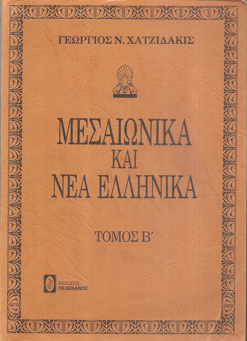ΧΑΤΖΙΔΑΚΙΣ ΓΕΩΡΓΙΟΣ Ν., Μεσαιωνικά καί Νέα Ελληνικά. Τόμοι Α΄- Β΄. Εν Αθήναις 1905-1907, 8ο, σελ. κ΄+ 662+765 (έκδ. «ΒΙΒΛΙΟΘΗΚΗ ΜΑΡΑΣΛΗ», ανατύπωση από τις έκδόσεις ΠΕΛΕΚΑΝΟΣ , ISBN 960-400-003-9 (set) , τ.Α΄ 960-400-001-2 , τ.Β΄ 960-400-002-0)