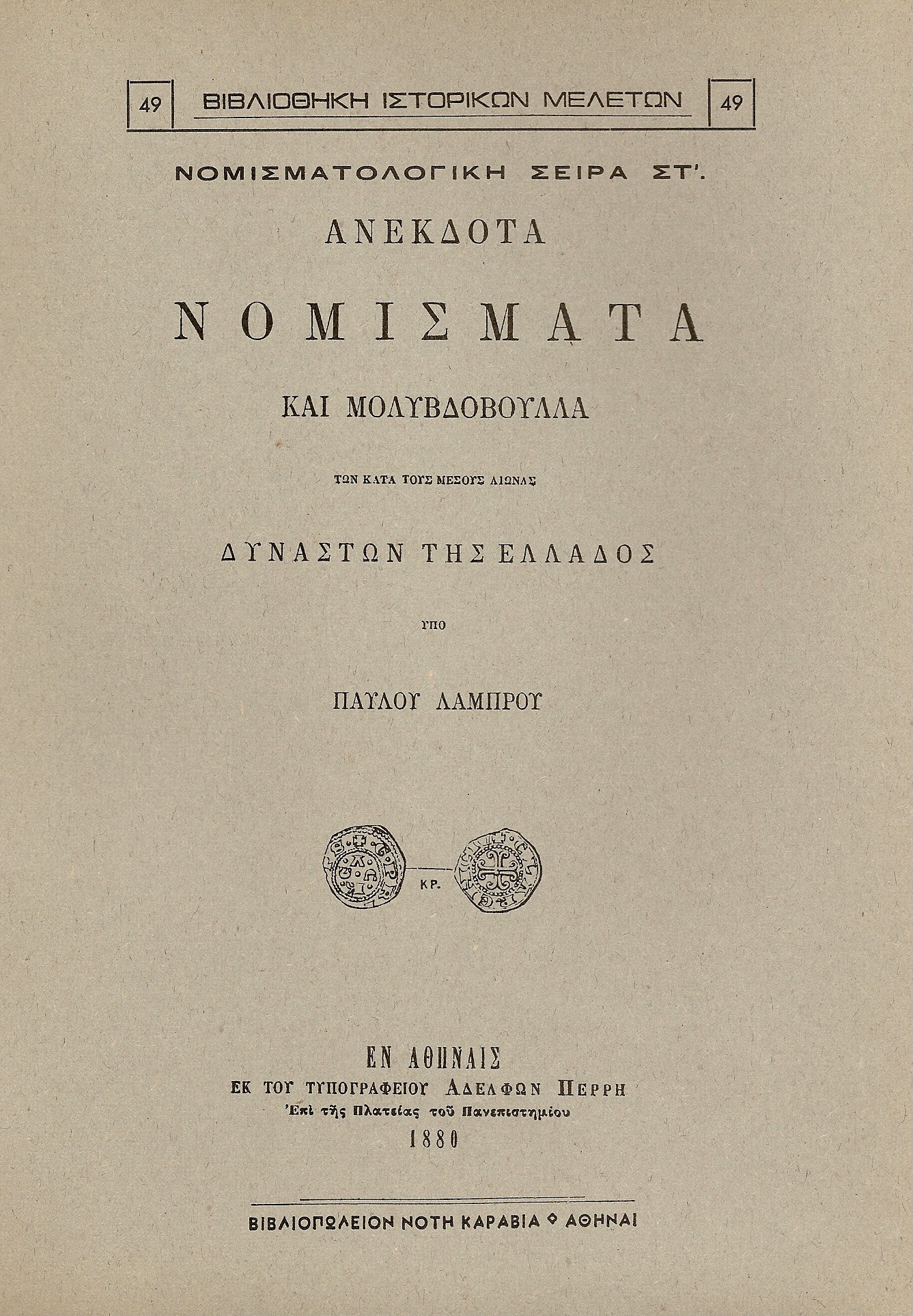 Λάμπρος, Παύλος, Ανέκδοτα νομίσματα και μολυβδόβουλλα των κατά τους μέσους αιώνας δυναστών της Ελλάδος, εν Αθήναις 1880. Το βιβλίο αποτελεί το έκτο μέρος της νομισματολογικής σειράς της Βιβλιοθήκης Ιστορικών Μελετών. Ο Παύλος Λάμπρος αναδημοσιεύει εδώ πραγματείες του, που είχαν δημοσιευθεί αρχικά σε ελληνικά, γερμανικά και γαλλικά περιοδικά, με συνολικά 57 ανέκδοτα νομίσματα και μολυβδόβουλλα των Δεσποτών της Ηπείρου και της Θεσσαλίας, της βαρωνίδος της Καρύταινας Ελένης, του βαρώνου της Βελιγοστής και του Δαμαλά (της Πελοποννήσου) Μαρτίνου Ζαχαρία, του δούκα των Αθηνών Γουΐδωνος Β´ Δελαρός, των κομητών των Σαλώνων (ʼμφισσας), του τριάρχου της Εύβοιας Γουλιέλμου του Βιλλεαρδουΐνου, των δουκών της Νάξου Νικολάου Α´ και Γεωργίου Α´, των Ηγεμόνων της Παλαιάς και της Νέας Φώκαιας Ανδρέα και Δομίνικου Καττάνεου, και μία ανέκδοτη σφραγίδα του Λατίνου επισκόπου της ʼνδρου Ιωάννη. Η επιστημονική περιγραφή των νομισμάτων και των μολυβδόβουλλων συνοδεύεται από κατατοπιστική ιστορική εισαγωγή των εικονιζόμενων προσώπων, που κυριάρχησαν στις ελληνικές χώρες την περίοδο της ύστερης βυζαντινής περιόδου, και καλλιτεχνική απεικόνιση 55 νομισμάτων.(ανατύπωσης 1972, βιομηχανική βιβλιοδεσία)