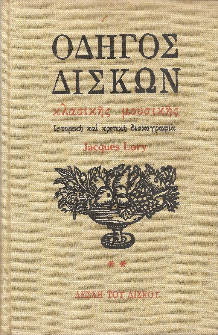 LORY JACQUES, Οδηγός δίσκων κλασικής μουσικής, Ιστορική και κριτική δισκογραφία. Τόμοι Α΄+Β΄. Αθήνα 1972, Λέσχη του Δίσκου, 8ο , σελ. λστ' + 260+ κδ' + 442, 230 ξυλογραφίες. (Βιομηχανική πάνινη βιβλιοδεσία)
