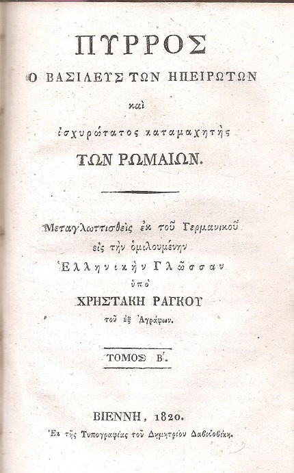 ΡΑΓΚΟΥ ΧΡΗΣΤΑΚΗ του εξ Αγράφων, Πύρρος ο Βασιλεύς των Ηπειρωτών και ισχυρώτατος καταμαχητής των Ρωμαίων. Μεαγλωττισθείς εκ του Γερμανικού εις την ομιλουμένην Ελληνικήν Γλώσσαν. Τόμοι Α΄+ Β΄. Βιέννη, Εκ της Τυπογραφίας του Δημητρίου Δαβιδοβίκη, 1820, 16ο, σελ. τ. Α΄ φ2+195+1λ+1εικ. , τ. Β΄ φ2+196 (Οι δύο τόμοι βιβλιοδετημένοι σ’έναν. Μειονεκτήματα : στον Β΄τόμο λείπουν δύο φύλλα ήτοι σελίδες 181-182 & 183-184. Η βιβλιοδεσία εποχής ταλαιπωρημένη, τα καπάκια της βιβλιοδεσίας αποκομμένα από το κυρίως σώμα και μέρος της αποκολημένης ράχης διασώζεται εντός του αντιτύπου, Γκίνης-Μέξας αρ. 1270 & Ηλιού αρ. 1820.111 & 1820.112)