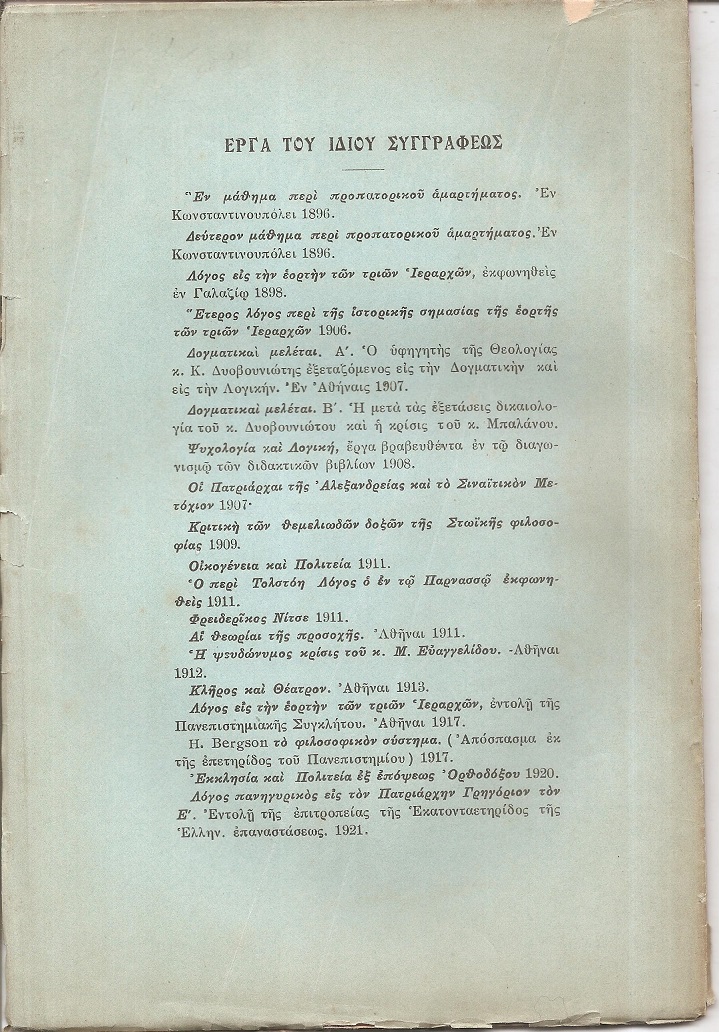 ΑΝΔΡΟΥΤΣΟΣ ΧΡΗΣΤΟΣ, Καθηγητής του Πανεπιστημίου, Η εκλογή του Μητροπολίτου Μελετίου Μεταξάκη Κανονικώς και κατά τους  Γενικούς Κανονισμούς εξεταζομένη. Εν Αθήναις, ΤΥΠΟΙΣ «ΠΡΟΜΗΘΕΩΣ», 1921, 8ο, σελ. 42+στ΄