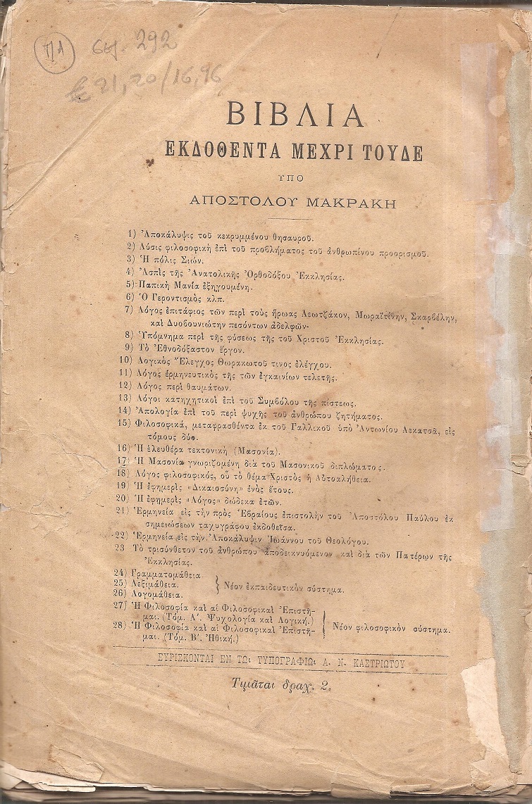 ΜΑΚΡΑΚΗΣ ΑΠΟΣΤΟΛΟΣ, Θεία και Ιερά Κατήχησις- καθώς εδιδάχθη υπό του Αγίου Πνεύματος και των επισήμων Αυτού οργάνων από της ημέρας της Πεντηκοστής μέχρι τέλους των επτά Οικουμενικών Συνόδων… Εν Αθήναις, ΕΚ ΤΟΥ ΤΥΠΟΓΡΑΦΕΙΟΥ Α. Ν. ΚΑΣΤΡΙΩΤΟΥ, 1985, 8ο, σελ. 292 (αντίτυπο ταλαιπωρημένο, ΗΛΙΟΥ-ΠΟΛΕΜΗ αρ. 1885.367)