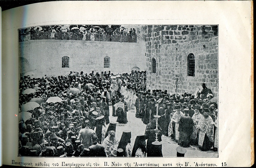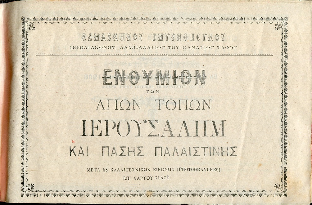 ΣΜΥΡΝΟΠΟΥΛΟΣ ΔΑΜΑΣΚΗΝΟΣ (Ιεροδιακόνος, λαμπαδαρίος του Παναγίου Τάφου), Ενθύμιον των Aγίων τόπων Ιερουσαλήμ και πάσης Παλαιστίνης. Μετά 63 καλλιτεχνικών εικόνων (photogravures) επί χάρτου glace. Eν τη Αγία Πόλει Ιερουσαλήμ 1908, 8ο πλάγιο, σελ. ιβ΄+238+63 εικ.