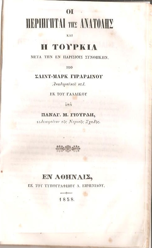ΣΑΙΝ-ΜΑΡΚ ΓΙΡΑΡΔΙΝΟΥ(Saint-Marc Girardin), Οι Περιηγηταί της Ανατολής και η Τουρκία μετά την εν Παρισίοις Συνθήκην. Εκ του Γαλλικού υπό ΠΑΝΑΓ. Μ. ΓΙΟΥΡΔΗ- Τελειοφύτου της Νομικής Σχολής. Εν Αθήναις 1858, 8ο, σελ. ή+130 (φυλλάδιον Α΄ : Εν Αθήναις, ΤΥΠΟΙΣ ΕΜΜΑΝΟΥΗΛ ΓΕΩΡΓΙΟΥ, 1858, σελ.ή+84, φυλλάδιον Β΄ : Εν Αθήναις, ΕΚ ΤΟΥ ΤΥΠΟΓΡΑΦΕΙΟΥ Δ. ΕΙΡΗΝΑΙΟΥ, 1858, σελ. 85-130, ΓΚΙΝΗΣ-ΜΕΞΑΣ 7667, αντίτυπο απόδετο, σε καλή κατάσταση, χωρίς εξώφυλλο)
