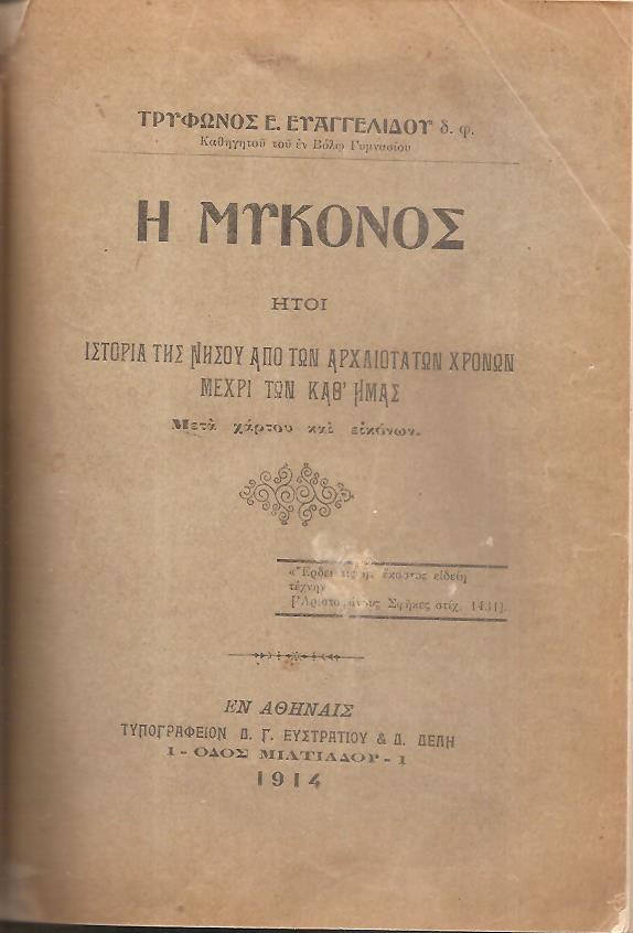 ΒΕΝΙΕΡΗΣ Χ. ΜΙΧΑΗΛ (Καθηγητής εν τη Δημοσία Εμπορική Σχολή και Πρόεδρος του Συνδέσμου των εν Ερμουπόλει Μυκονίων), [1]. Η εν Μυκόνω Ιερά Μονή Τουρλιανή. ΄Εκδοσις 2α, διασκευασθείσα. Εν Ερμουπόλει Σύρου, ΕΚ ΤΟΥ ΤΥΠΟΛΙΘΟΓΡΑΦΕΙΟΥ ΝΙΚΟΛΑΟΥ ΦΡΕΡΗ, 1907, 16ο, σελ. ιστ΄+[17]-48 (πρόβλημα στις σελίδες ζ΄-ή & 47, λείπει το οπισθόφυλλο). [2]. ΕΥΑΓΓΕΛΙΔΗΣ ΤΡΥΦΩΝ Ε., Η Μύκονος ήτοι ιστορία της νήσου από των αρχαιοτάτων χρόνων μέχρι των καθ’ημάς. Εν Αθήναις 1914, 8ο, σελ. δ΄+[5]-290 (λείπουν σελίδες 291-318). [3]. ΖΕΡΛΕΝΤΗΣ ΠΕΡΙΚΛΗΣ Γ., Περί του εν Μυκόνω Σχολείου του Αγίου Λουκά. Απόσπασμα εκ της Επετηρίδος του Φιλ. Συλλόγου Παρνασσού του 1917. Εν Αθήναις, ΤΥΠΟΙΣ Π. Δ. ΣΑΚΕΛΛΑΡΙΟΥ, 1918, 8ο, σελ. 1λ+[176]-194(λείπει το οπισθόφυλλο). [4]. ΜΟΝΟΓΥΙΟΣ ΕΥΑΓΓ. Ι. (Ιεροδιακόνου), Τα Μυκονιάτικα, (Λαογραφία της Μυκόνου). Εν Ερμουπόλει Σύρου, ΕΚ ΤΟΥ ΤΥΠΟΓΡΑΦΕΙΟΥ ΑΘΑΝΑΣΙΟΥ ΣΚΟΡΔΙΛΗ, 1927, 8ο, σελ. ή+[9]-79+1χ.α. (τα τέσσερα βιβλία σ’ ένα δερματόδετο τόμο)