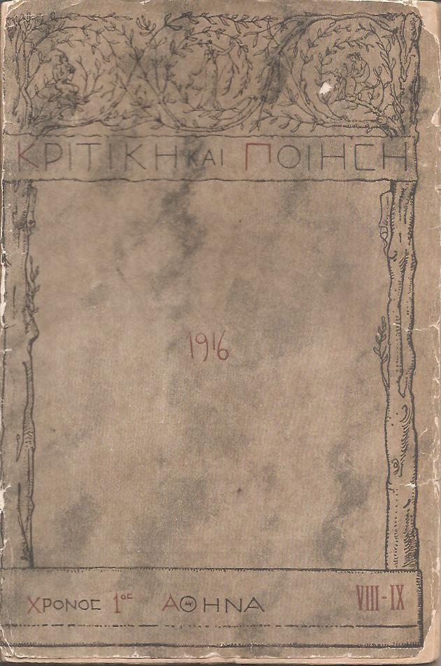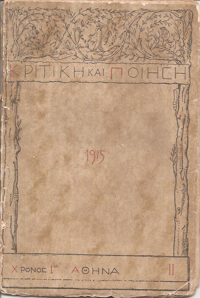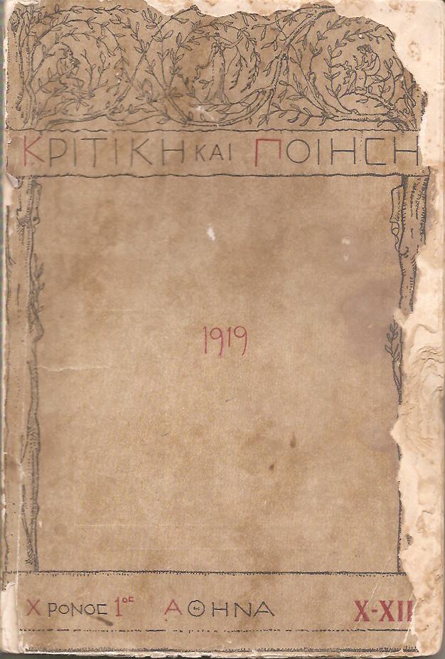 ΚΡΙΤΙΚΗ ΚΑΙ ΠΟΙΗΣΗ 1915-1919, Μηνιαία έκδοση. Αθήνα, ΤΥΠΟΓΡΑΦΕΙΟ Η. ΠΑΠΑΠΑΥΛΟΥ, 1915-1919, 8ο, ( Διαθέτουμε τα τεύχη : Χρόνος 1ος (1915-1919), αρ. Ι[Μάρτης 1915], σ. 36, από το 2ο τεύχος[ΤΥΠΟΓΡΑΦΕΙΟ ΑΘΑΝ. ΠΑΠΑΣΠΥΡΟΥ], αρ. ΙΙ[Απρίλης 1915], σ. 37-68(λείπει οπισθόφυλλο), αρ. ΙΙΙ[Μάης 1915], σ. 69-106, αρ. IV[Ιούνιος 1915], σ. 107-130, αρ. V-VI[Αύγουστος-Σεπτέβριος 1915], σ. 131-168+2χ.α., το τεύχος VII λείπει, αρ. VIII-IX[Σεπτέβρης-Οχτώβρης 1916], σ. 209-278, αρ. X-XII[Ιούλιος 1919], σ. 279-390+4[περιεχόμενα του Α΄τόμου Μάρτης 1915-Ιούλιος 1919). Περιεχόμενα: τεύχος αρ. Ι. Σ. Αλιμπέρτης: Εμμ. Ροΐδης – Εσσαί. – Τρουβέρος: Η ιστορία του Τριστάνου και της Υζέτας (από τα γαλλικά). – Σ. Α.: Πολιτικό Δελτίο. – Γ. Μ. Αποστολάκης: Ο Βίος του Θωμά Καρλάϊλ – Ι : Η Δοκιμασία. – τεύχος αρ. ΙΙ. Dante Gabriel Rosseti: Λιλίθ. – Γι. Μ. Αποστολάκης: Ο Βίος του Θωμά Καρλάϊλ – ΙΙ: Η γνωριμία με το Γκαίτε. – Τρουβέρος: Η ιστορία του Τριστάνου και της Υζέτας. Μυστικός: Παραλλαγές. – Σ. Αλιμπέρτης: Εμμ. Ροΐδης – Εσσαί. – Έσπερος: Τα δέντρα και το Αττικό τοπείο. – Κριτική: Βιβλιογραφία. – τεύχος αρ. ΙΙΙ. Γι. Μ. Αποστολάκης: Ο Βίος του Θωμά Καρλάϊλ – ΙΙΙ: ΣτηνΕρημιά. – Τρουβέρος: Η ιστορία του Τριστάνου και της Υζέτας. – Σ. Αλιμπέρτης: Για το σημερινό Πόλεμο. – τεύχος αρ. IV. Σ. Αλιμπέρτης: Η ΄Εκδοση των έργων του Μαβίλη. – Τρουβέρος: Η ιστορία του Τριστάνου και της Υζέτας. – Γι. Μ. Αποστολάκης: Ο Βίος του Θωμά Καρλάϊλ – ΙV: Δόξα. – Θεατρική κίνηση. – τεύχος αρ. V-VI. Γι. Μ. Αποστολάκης: Ο Βίος του Θωμά Καρλάϊλ – V: Φλυαρίες. – VI: Η Γερμανία. – Walter Pater: Sandro Botticelli. – Σ. Αλιμπέρτης: Εξ αφορμής μιάς συλλογής στίχων. – ⁂ Κριτικές Πενιές. – τεύχος αρ. VIII-IX. Novalis: ΄Υμνοι στη Νύχτα. – ΄Αλ. Μπουρνιά: Παραλλαγές. – Γι. Αποστολάκη: ΄Ενας φιλολογικός πρόγονος – Γιάννης Καμπύσης. – J. Michelet: Η Μανόν Λεσκό – Ο θάνατος του Βαττώ. – Κριτικές πενιές. – τεύχος αρ. X-XII: Γκαίτε: Οι σπουδές του Γουλιέλμου Μαΐστερ. – Γιάν. Αποστολάκη: Η κριτική. – Νίτσε: Η αρχαία Ελληνική Πολιτεία. – Σπ. Αλιμπέρτη: Ιάκωβος Πολυλάς. – Γιαν. Αποστολάκη: Μία Προσθήκη. – Θεατρική Κίνηση. – Κριτικές πενιές. (Το τελευταίο τεύχος X-XII τυπώθηκε στο τυπογραφείο ΠΑΡΑΣΚΕΥΑ ΛΕΩΝΗ και είναι σητόβρωτο στα εξωτερικά περιθώρια στις πρώτες σελίδες). Λείπει το τεύχος VII(7) για να είναι πλήρης σειρά.