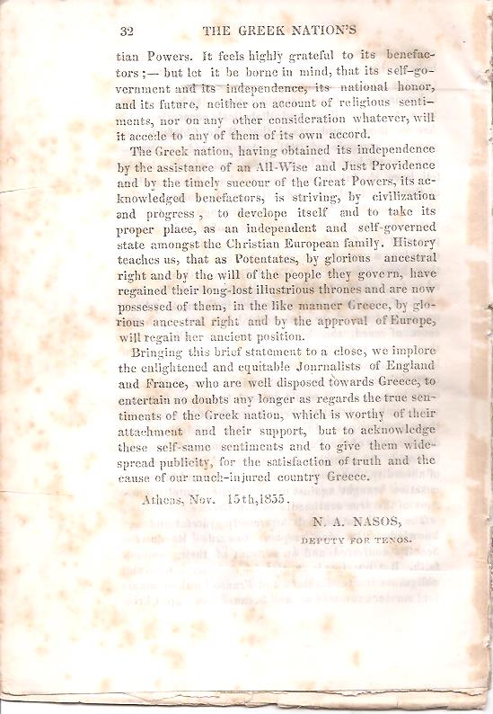 ΝΑΖΟΣ Ν. Α. (Βουλευτής Τήνου), Απολογία του Ελληνικού Έθνους ή Σύντομος Έκθεσις των διατρεξάντων και ολίγαι λέξεις πρός απάντησιν. Τρίγλωσσο κείμενο Ελληνικά-Γαλλικά-Αγγλικά. Αθήνησιν, ΕΚ ΤΟΥ ΤΥΠΟΓΡΑΦΕΙΟΥ ΑΘΗΝΑΣ, 1855, 8ο σελ. 32 (απόδετο, χωρίς εξώφυλλο, "απολογία για την Επανάσταση της Ηπείρου και Θεσσλίας το 1854", ΓΚΙΝΗΣ-ΜΕΞΑΣ, αρ. 6392)